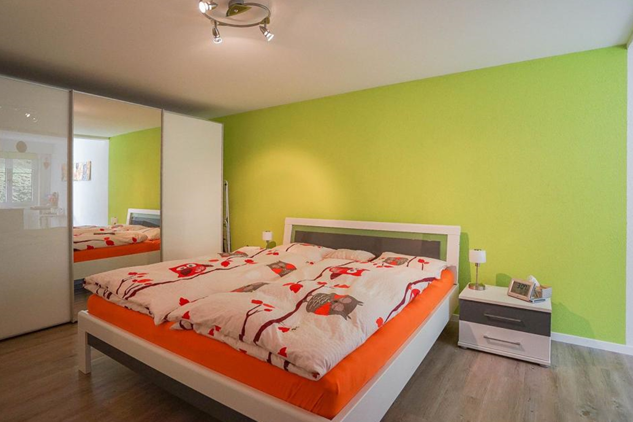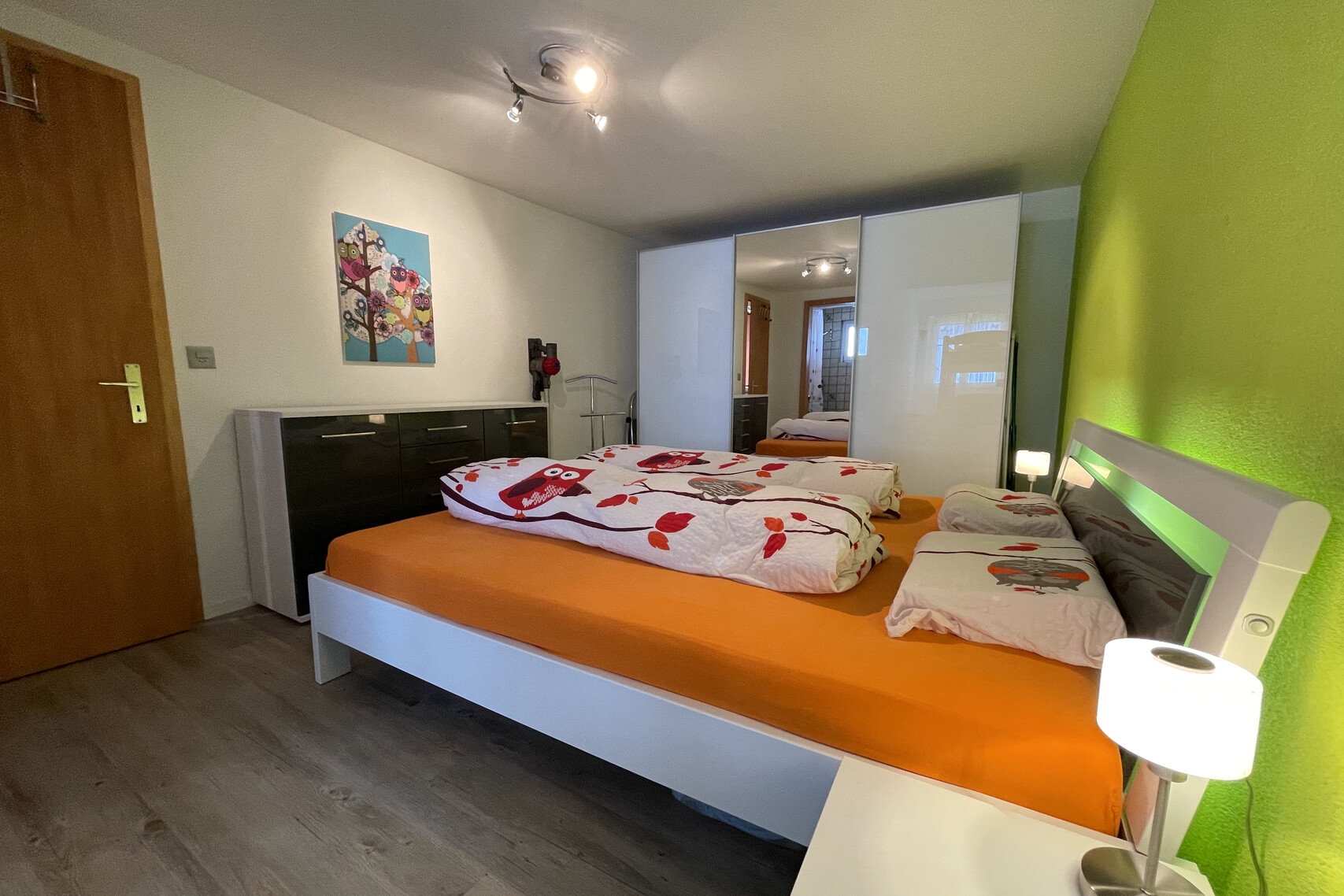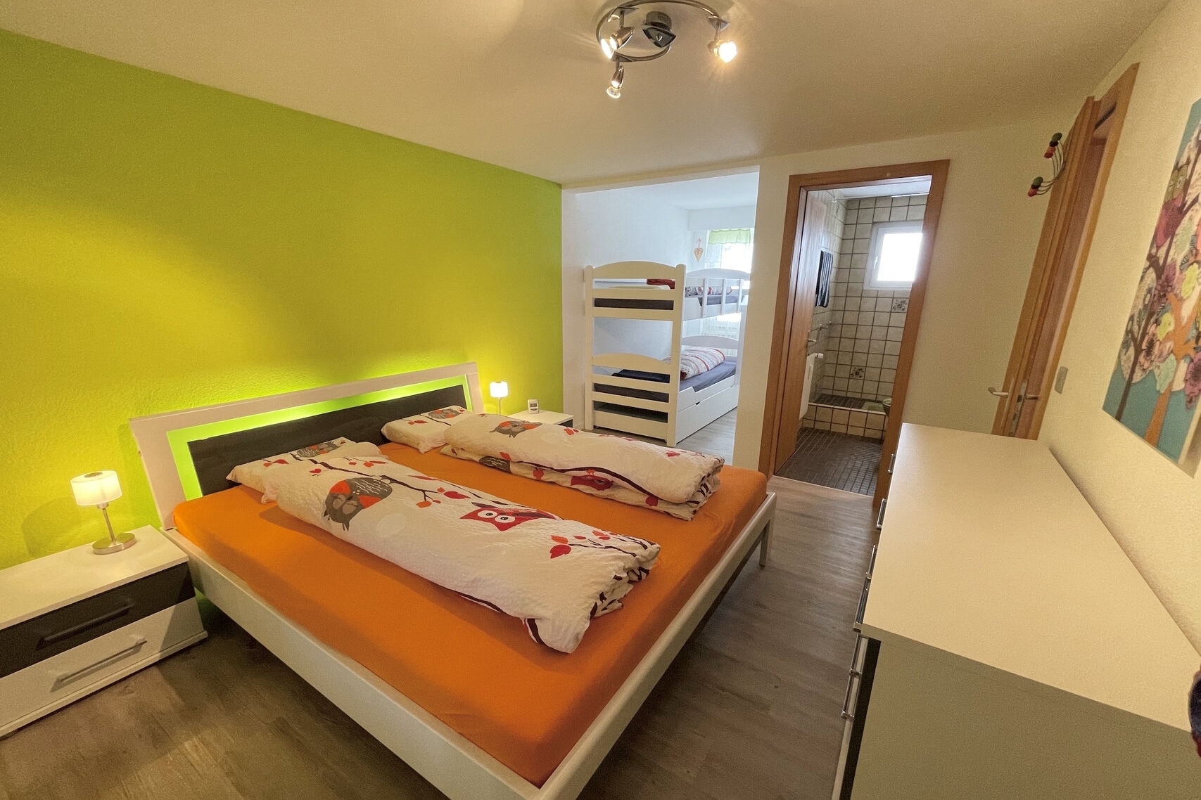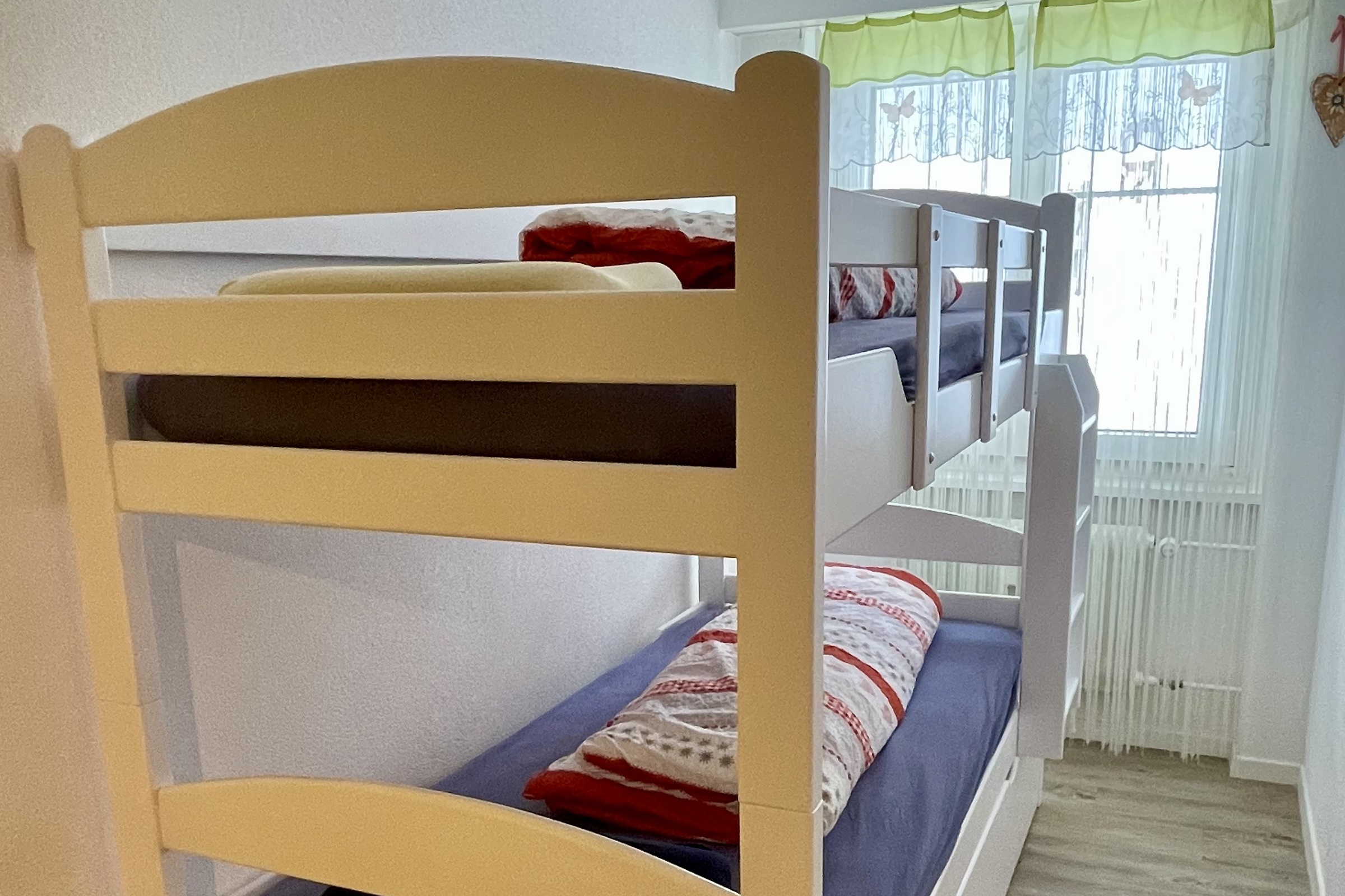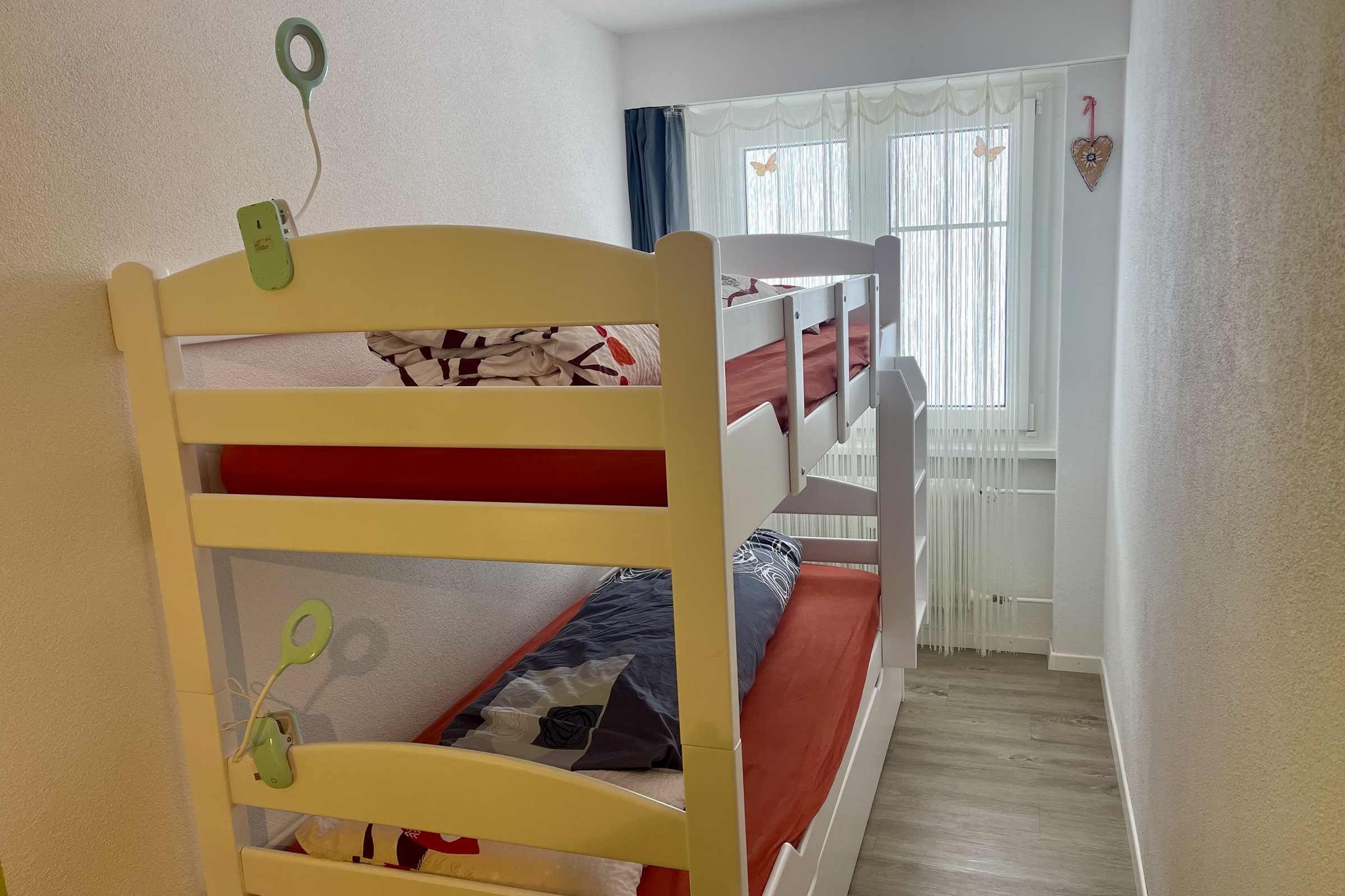 Das Schlafzimmer ist mit einem grossen Doppelbett und einem Etagenbett ausgestattet. Ein Babybett ist vorhanden.
