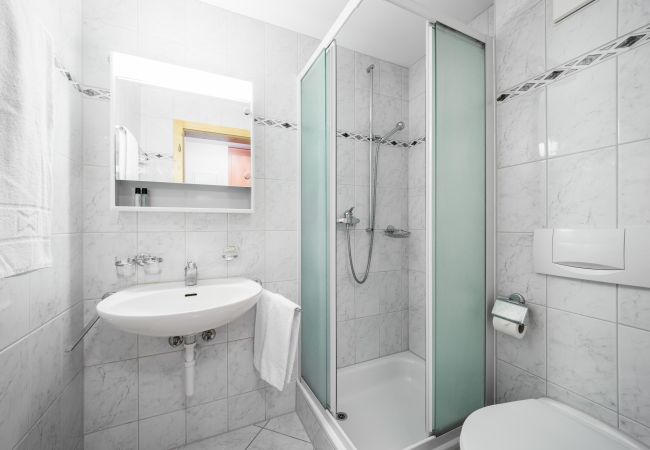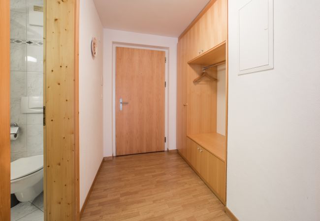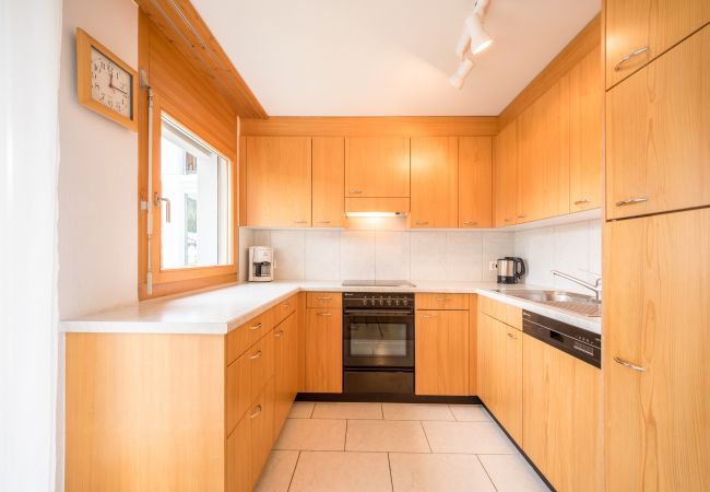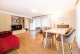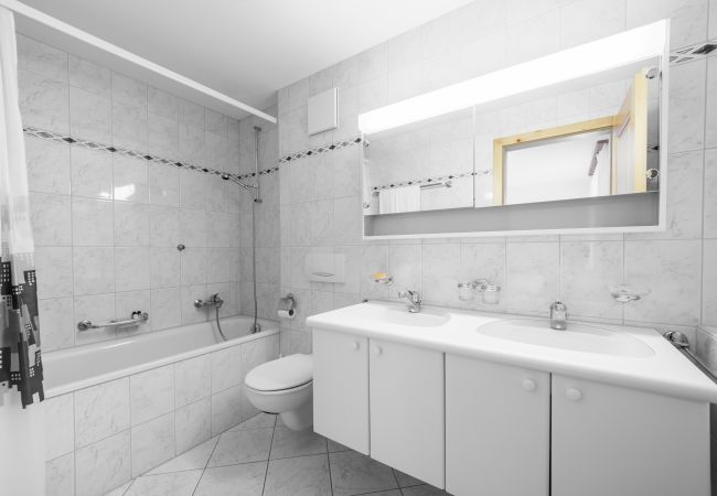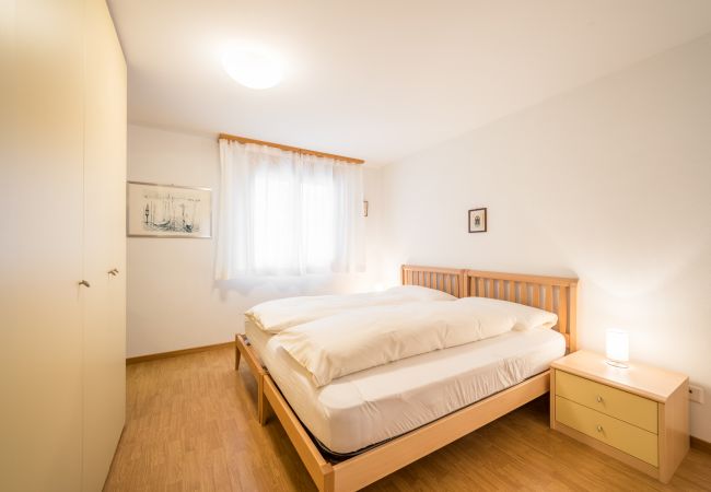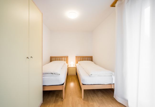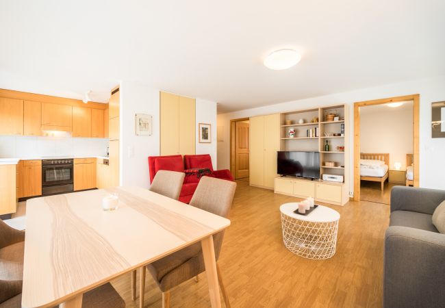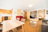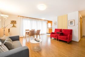 Ein Schlafzimmer mit Doppelbett und eigenem Bad, ein Kinderzimmer mit zwei Einzelbetten und ein separates Badezimmer. Geräumiger Wohnraum, sehr hell mit Balkon und toller Aussicht auf die Berge. Die grosse Küche ist komplett eingerichtet und hat einen Esstisch. Die Wohnung ist ideal für Familien.