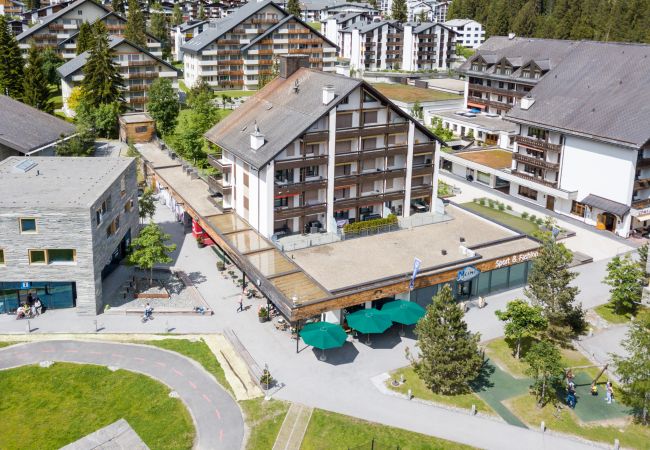 Diese grosszügige 5.5-Zimmerwohnung befindet sich im 4. Stock eines Mehrfamilienhauses direkt bei der Talstation in Laax mit Sicht auf das Rocksresort und die Piste.