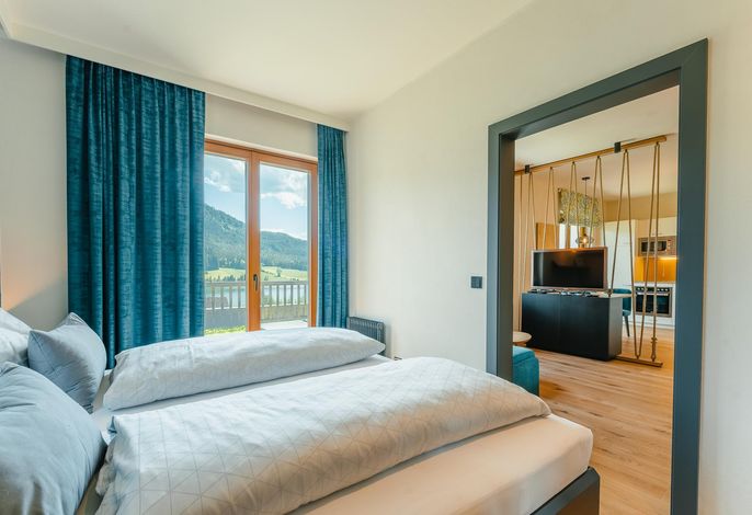 Doppelzimmer im Haupthaus (30 m²), Blick zum Wald (ohne Balkon), bestehend aus Schlafraum, Wohnraum, Kühlschrank, Dusche/WC.