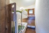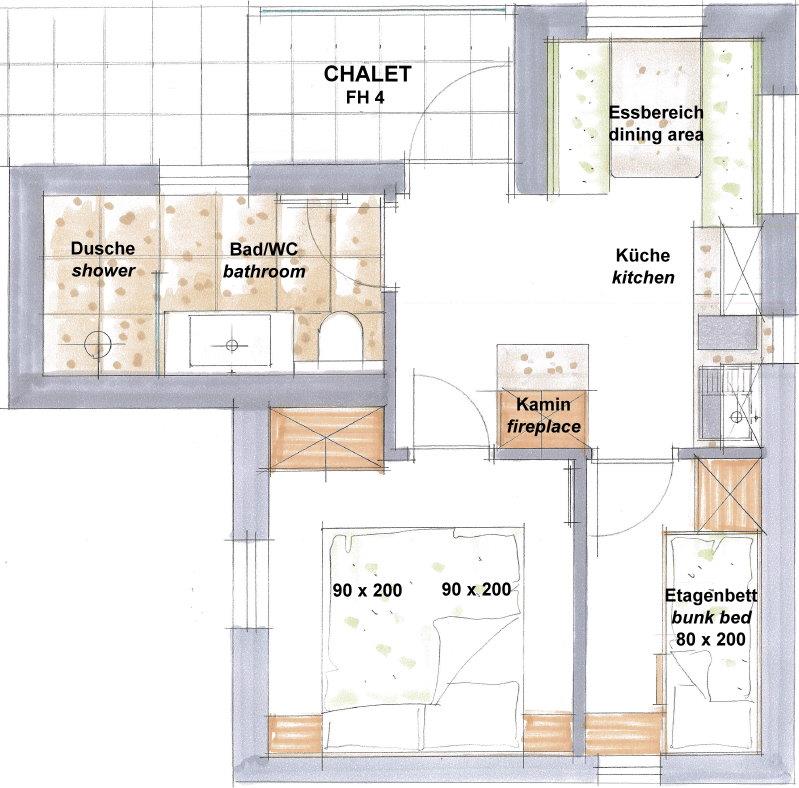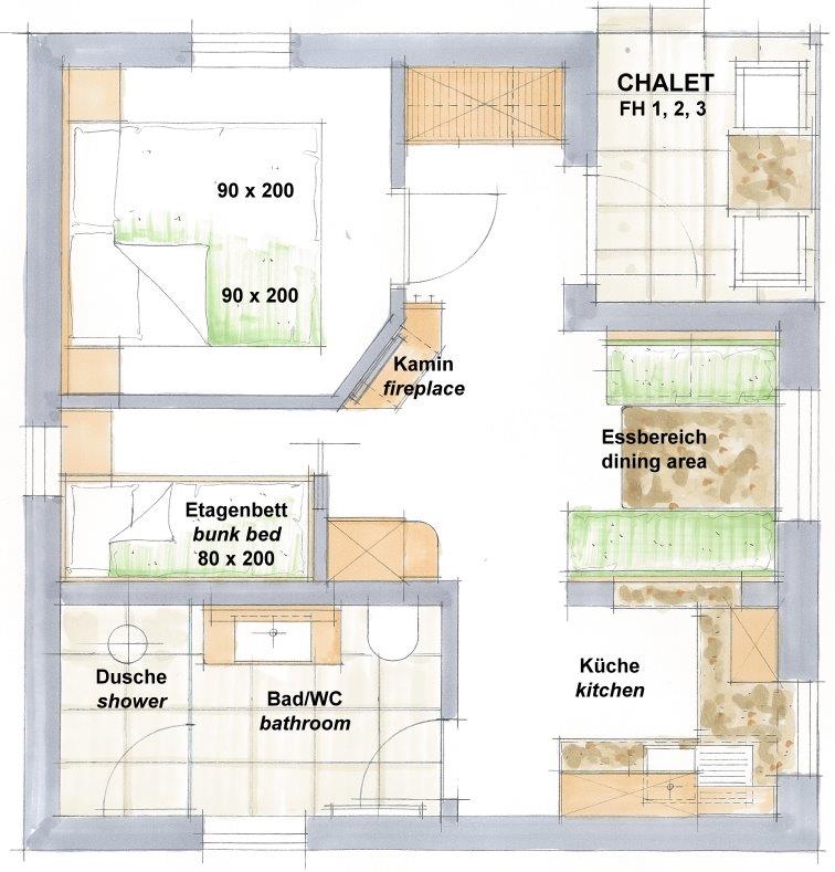 Wohnbereich mit Sitzecke, Schlafraum mit Doppelbett, Schlafraum für Kinder, Küche/Kochnische, Bad mit WC, kleine Veranda