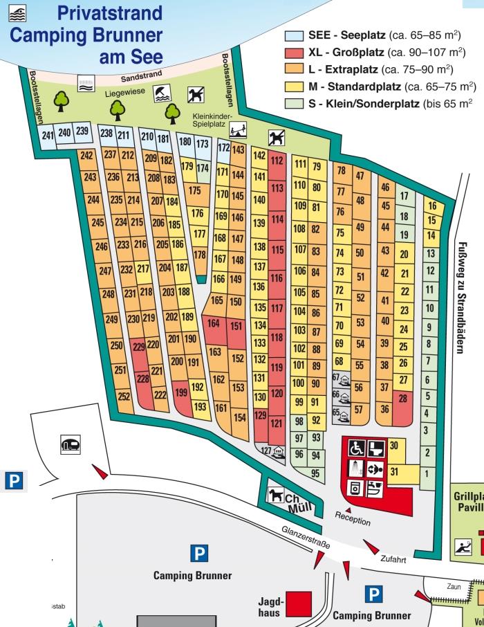 Gepflegte Stellplätze mit Rasen/Kies/Sand, Kategorien (65 m² - 108 m²): M-Standard, L-Extra, XL-Groß und SEE | alle mit CEE-Stromanschluss (6A, einige mit 16A + SAT), Wasser- und Abwasseranschluss |