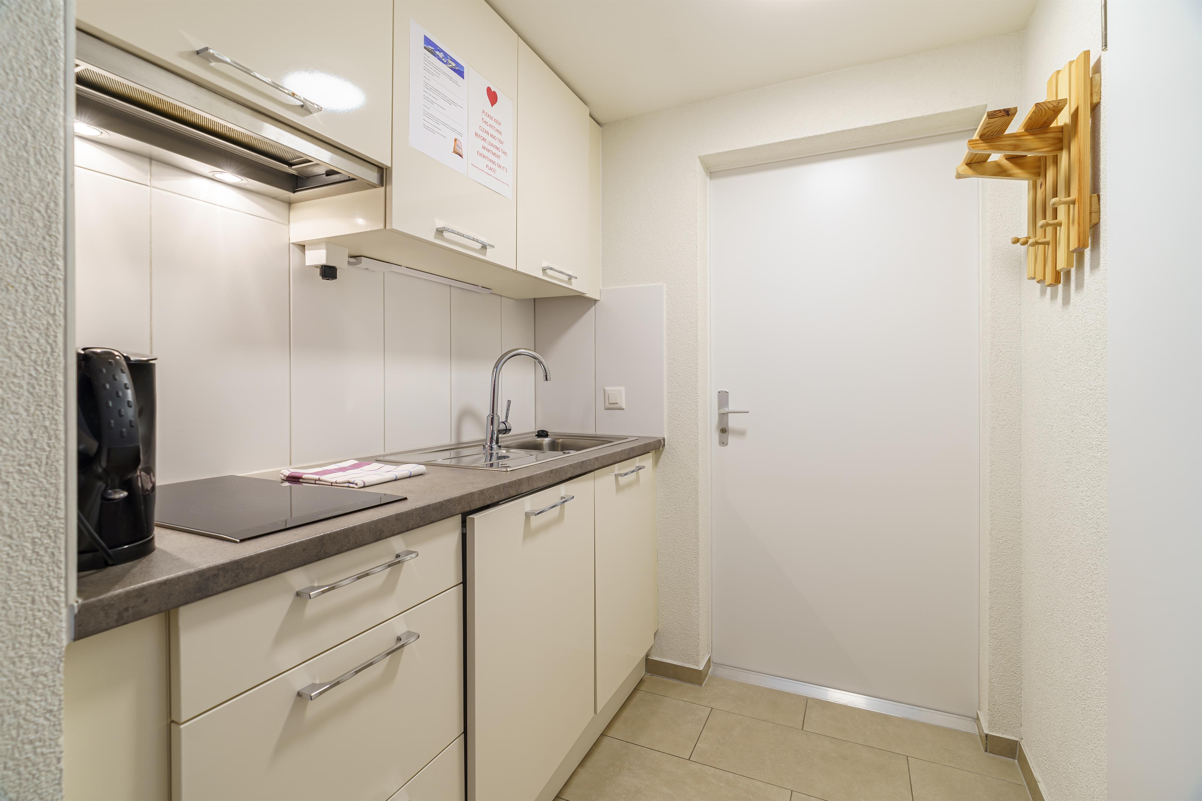 Dieses neuwertige Studio im Haus Astoria (20 m²,) bietet Platz für 2 Personen und optional ein Kleinkind. Es verfügt über ein Doppelbett, eine gut ausgestattete Küche mit Kühlschrank und Kaffeemaschine sowie ein Badezimmer mit Dusche und WC. Bettwäsche und Handtücher sind im Preis inbegriffen. Außerdem gibt es einen TV-Flachbildschirm. Das Studio ist ein Nichtraucherbereich.