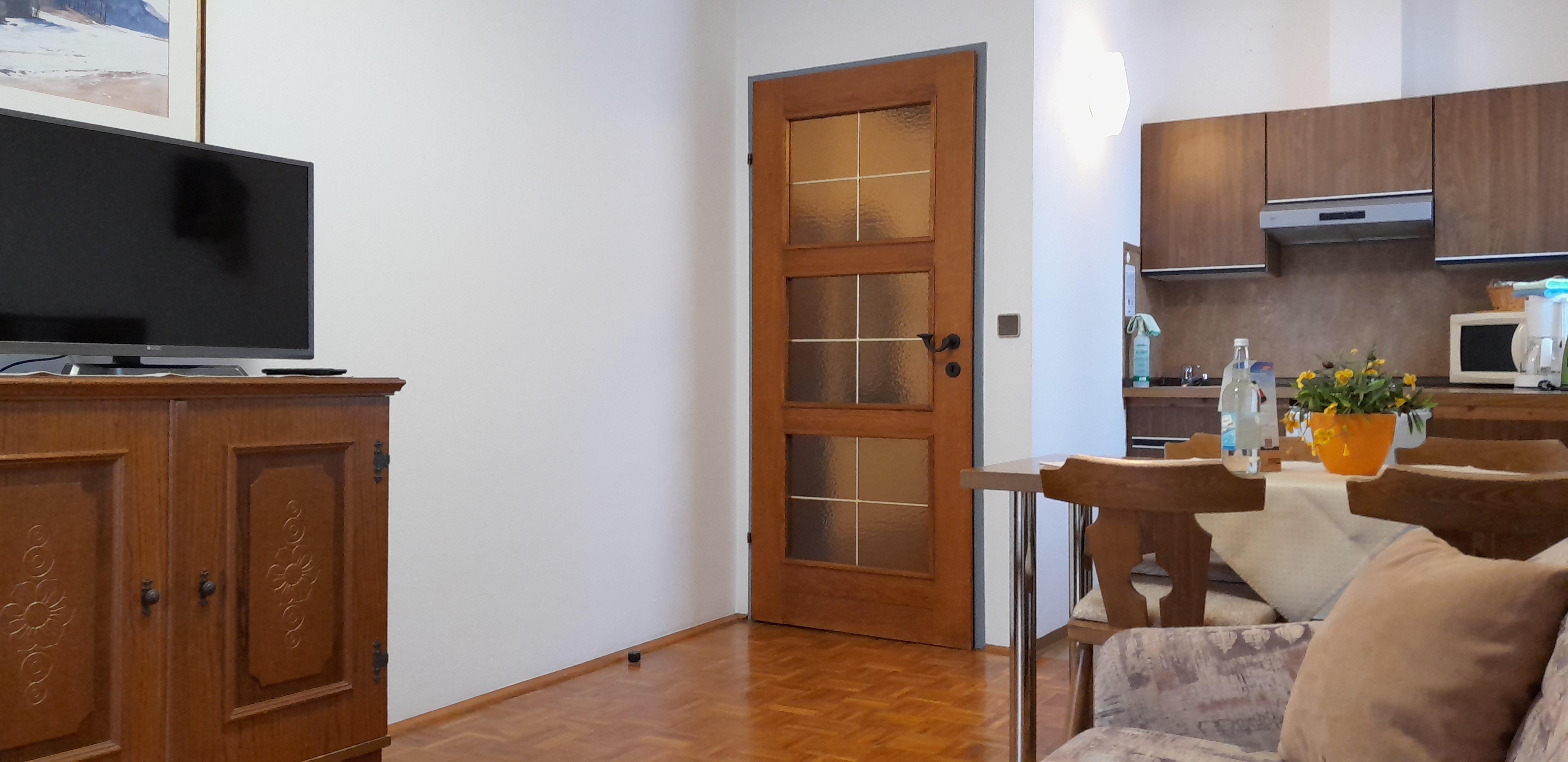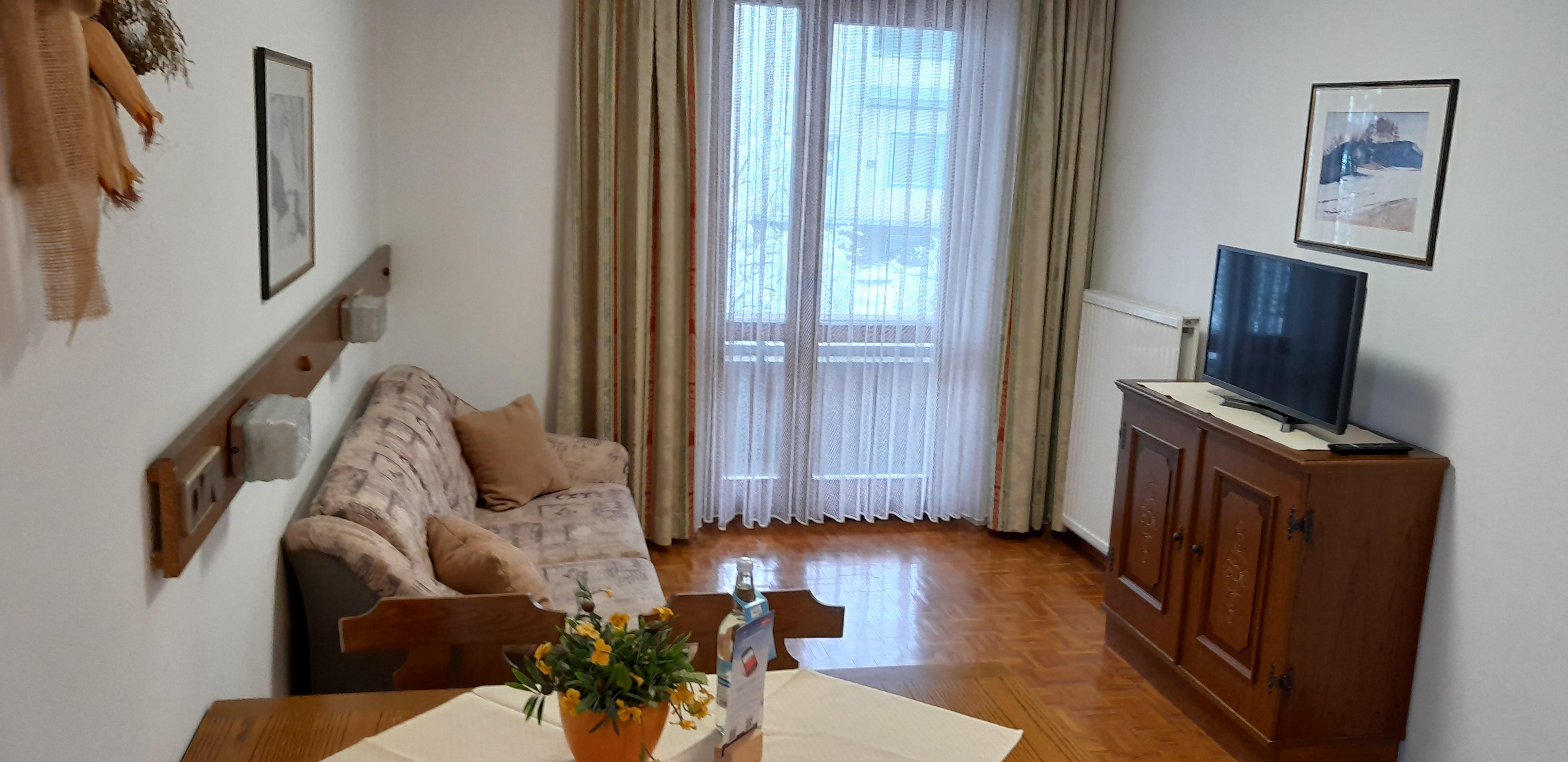 Appartement mit 50 m² im Erdgeschoss, Kochecke, 1 Doppelbett/Schlafzimmer, 1 Wohnraum mit Doppel/Ausziehbett, WC/Dusche getrennt, Sat-TV, Radio, Telefon, Zimmersafe, Brötchenservice, Balkon, Gratis W-LAN