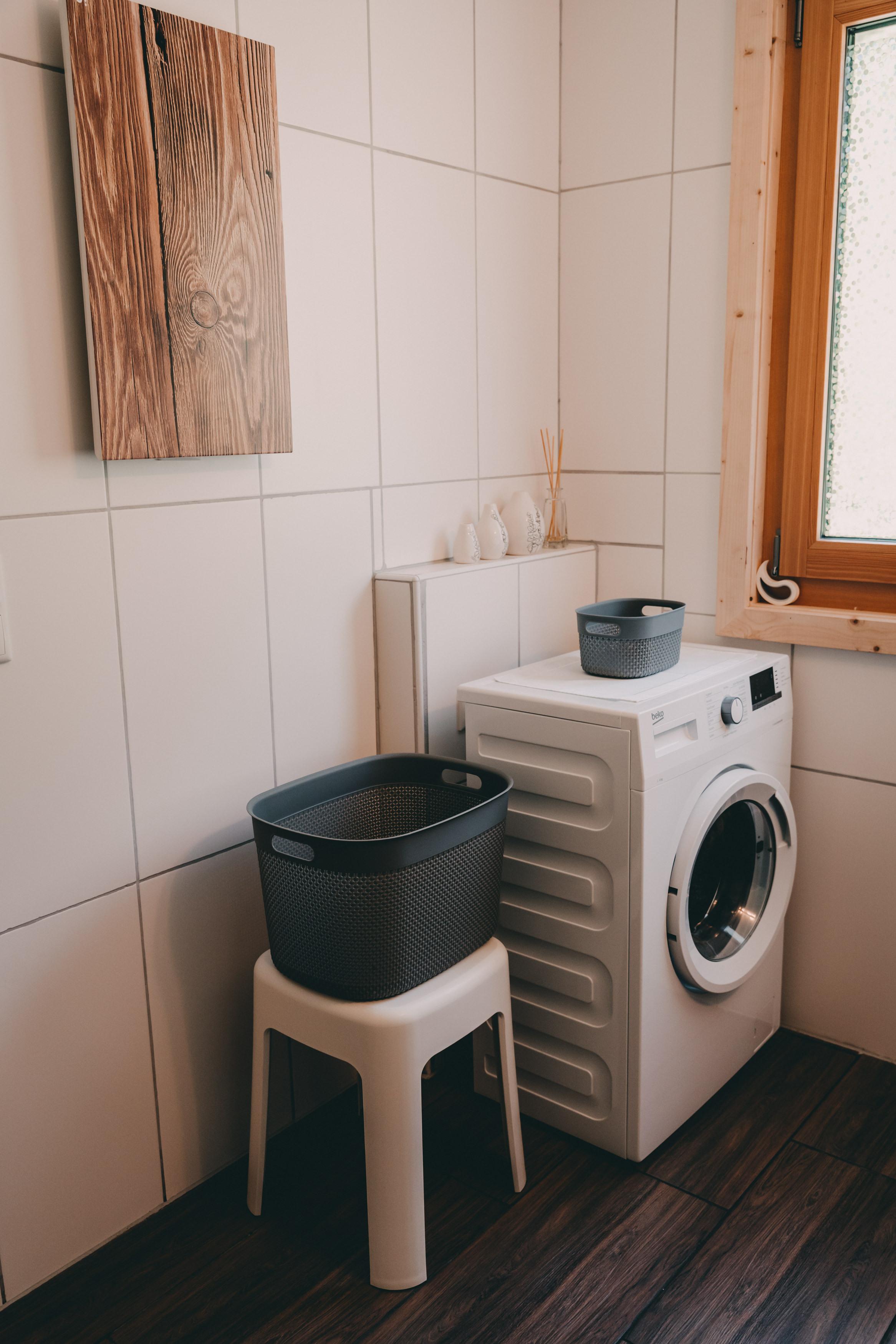 • Badezimmer mit geräumiger Dusche, Doppelwaschbecken und Waschmaschine