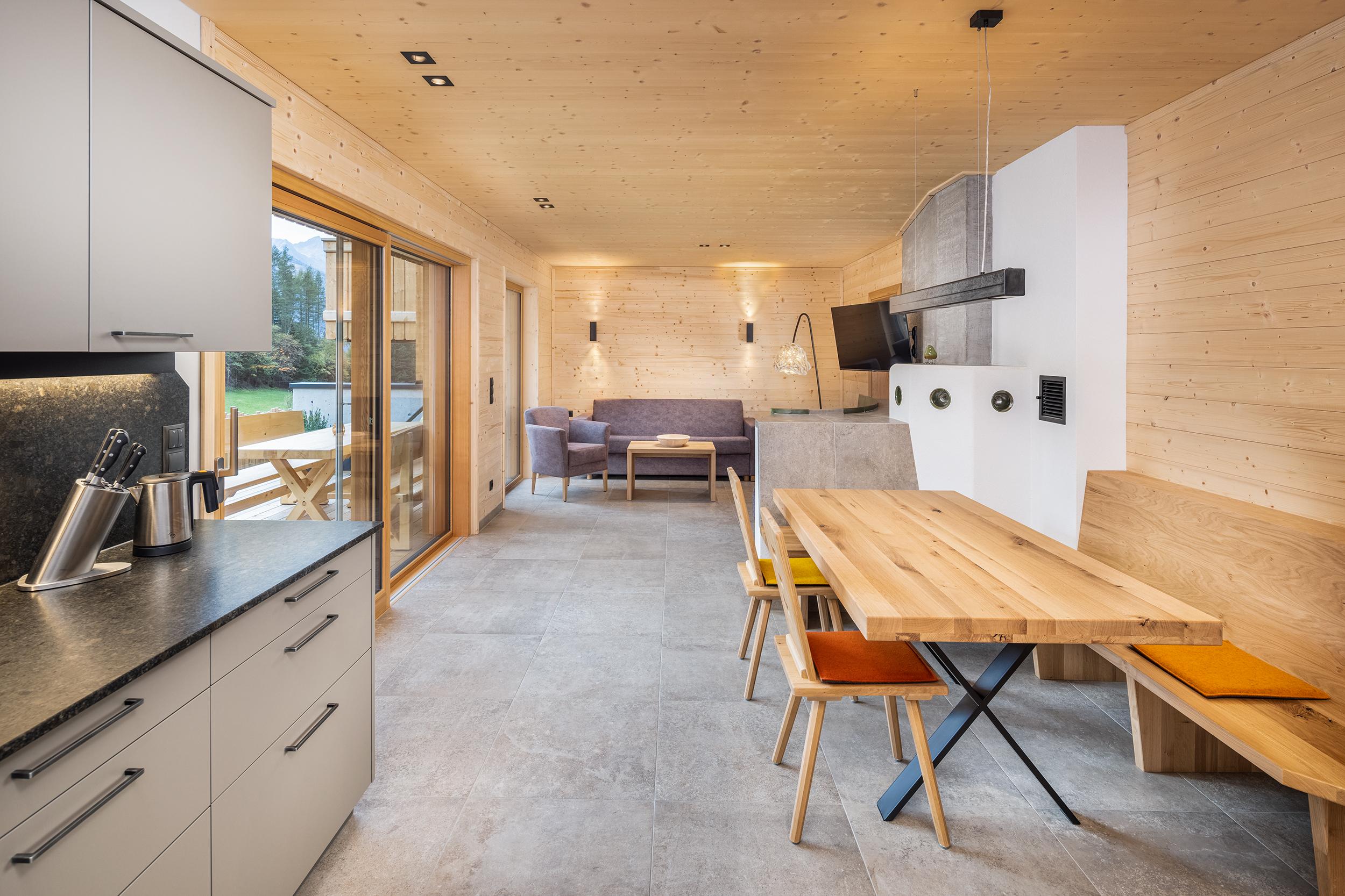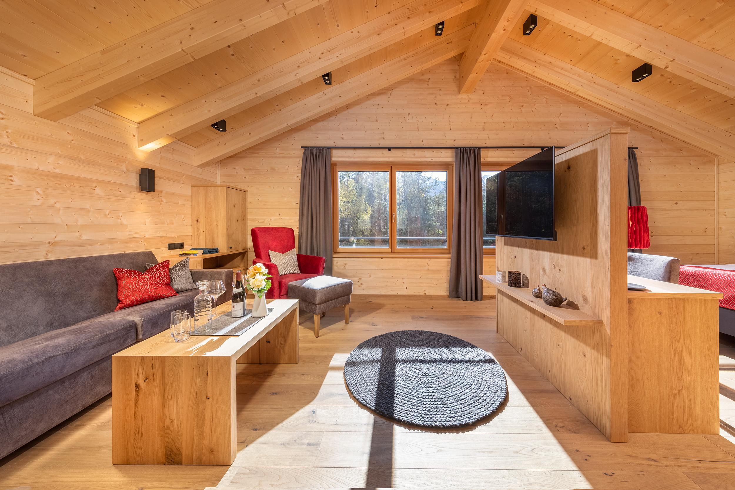 Das Chalet Privat mit ca. 100 m² groß und besteht aus: einer großzügigen Wohnküche mit voll ausgestatteter Küchenzeile, großem Esstisch, Wohnbereich mit einer bequemen Couch, 1 gemütliches Schlafzimmer mit eigenem Badezimmer und Balkon im Obergeschoss, privater Wellnessbereich mit Sauna (finnisch, Soft- und Infrarotfunktion) und Dusche, eigene Terrasse mit südwestlicher Ausrichtung, Massivholzmöbeln und Sonnenliegen