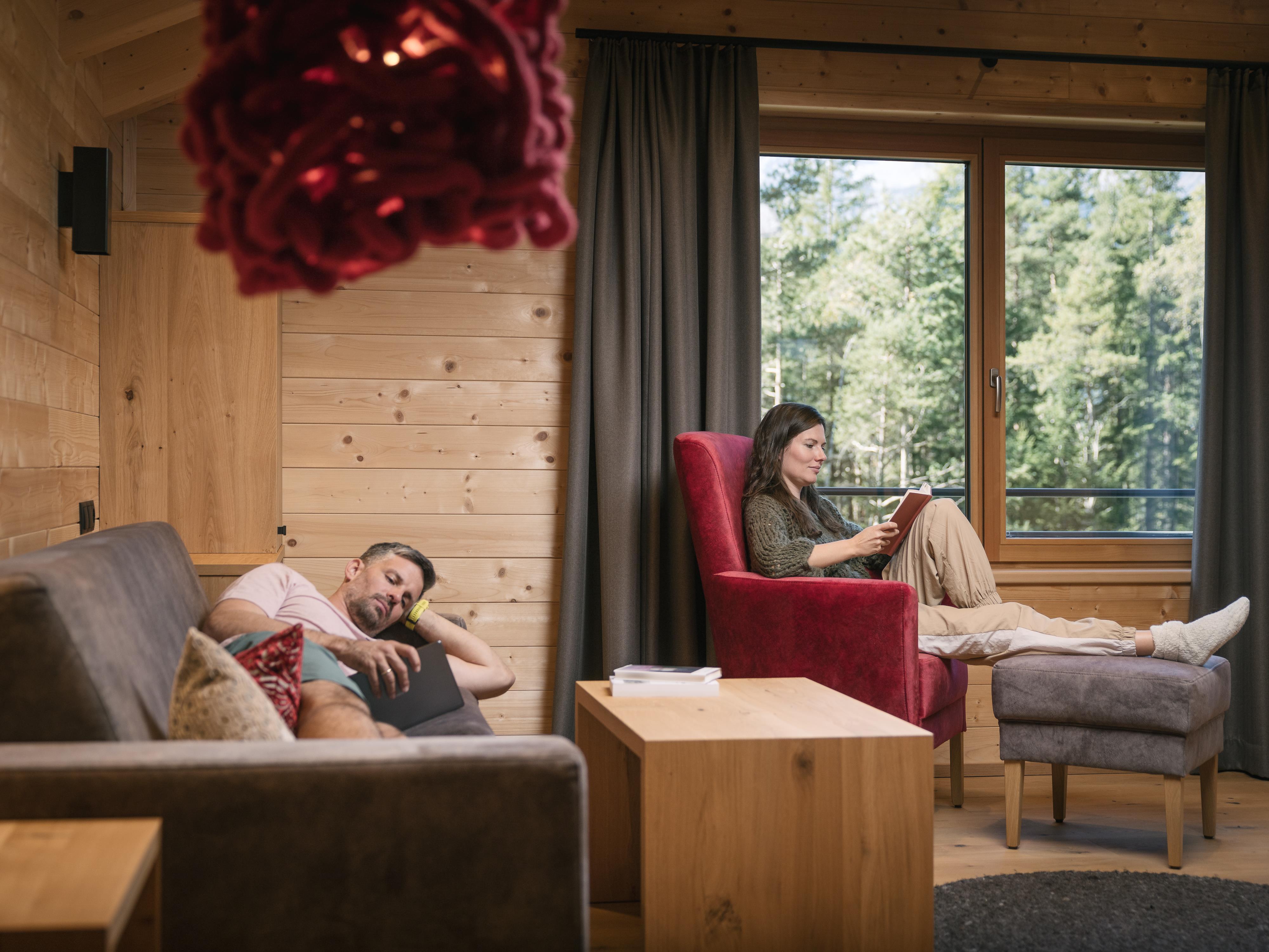 Das Chalet Familien mit ca. 150 m² besteht aus: 1 Panoramazimmer mit Kochnische, Doppelbett und Stockbett sowie eigenem Badezimmer mit WC und Dusche, 2 Doppelzimmer mit jeweils eigenem Bad, WC und Balkon. Im Erdgeschoss befindet sich eine geräumige Wohnküche mit vollausgestatteter Küchenzeile, großem Tisch, Wohnbereich mit TV. Zugang zur privaten Wohlfühloase mit Sauna, Infrarotkabine und Dusche, große Terrasse mit süd-west Blick, Tisch und Bänke aus Massivholz und Liegestühle