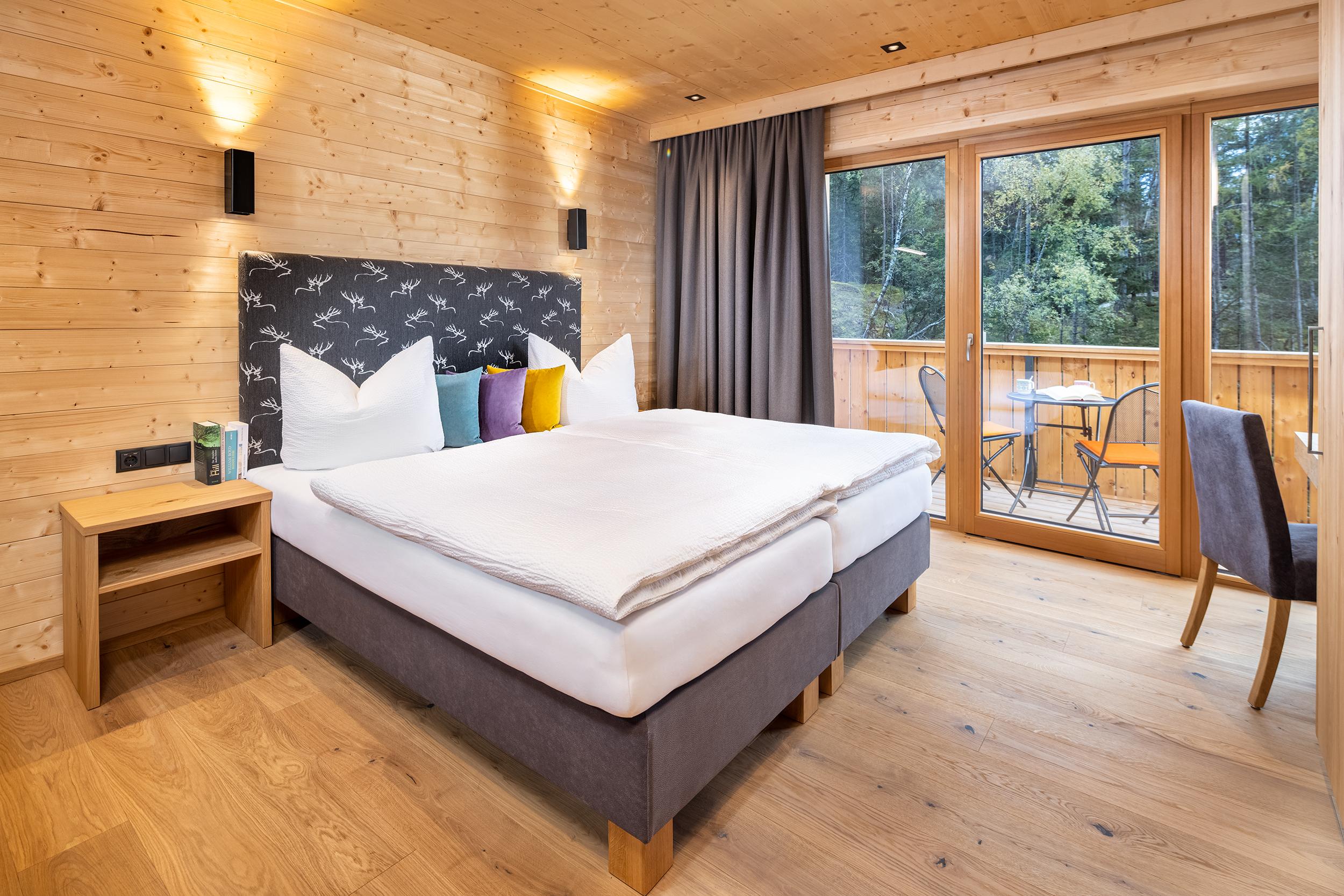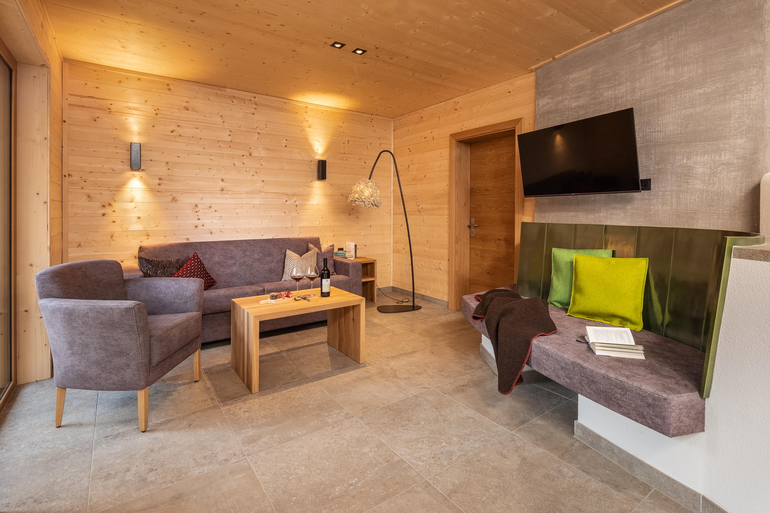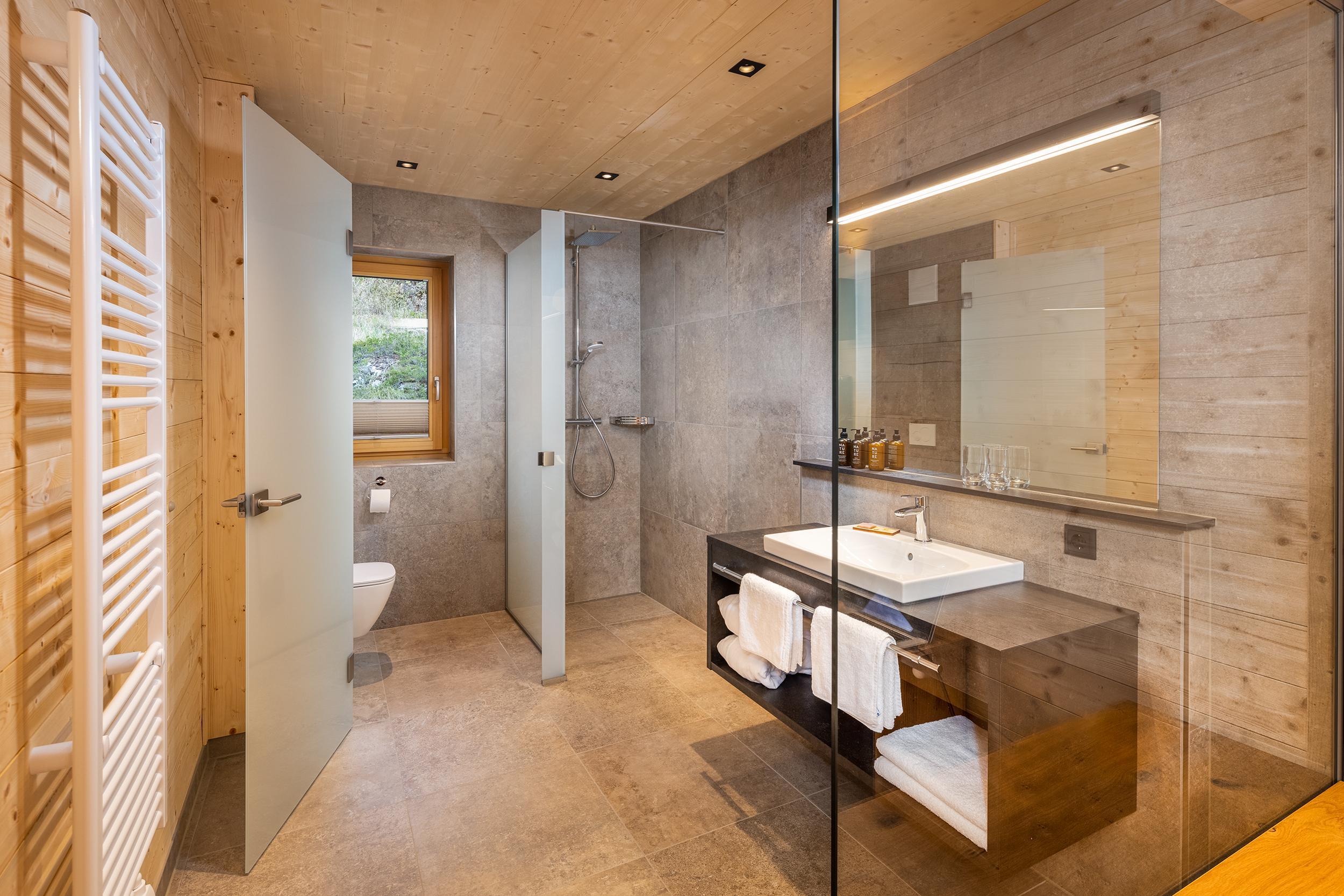 Das Chalet Familien mit ca. 150 m² besteht aus: 1 Panoramazimmer mit Kochnische, Doppelbett und Stockbett sowie eigenem Badezimmer mit WC und Dusche, 2 Doppelzimmer mit jeweils eigenem Bad, WC und Balkon. Im Erdgeschoss befindet sich eine geräumige Wohnküche mit vollausgestatteter Küchenzeile, großem Tisch, Wohnbereich mit TV. Zugang zur privaten Wohlfühloase mit Sauna, Infrarotkabine und Dusche, große Terrasse mit süd-west Blick, Tisch und Bänke aus Massivholz und Liegestühle