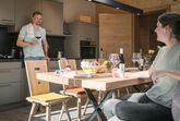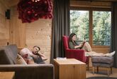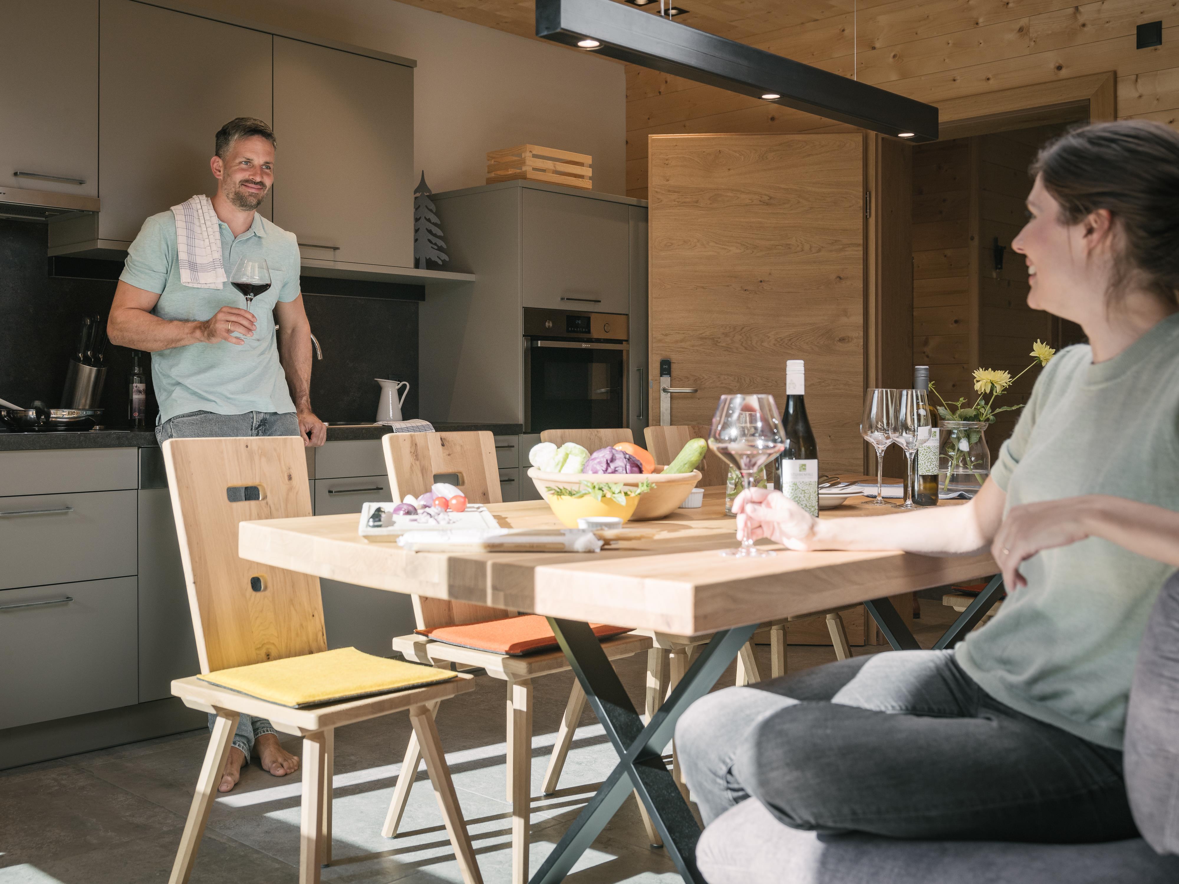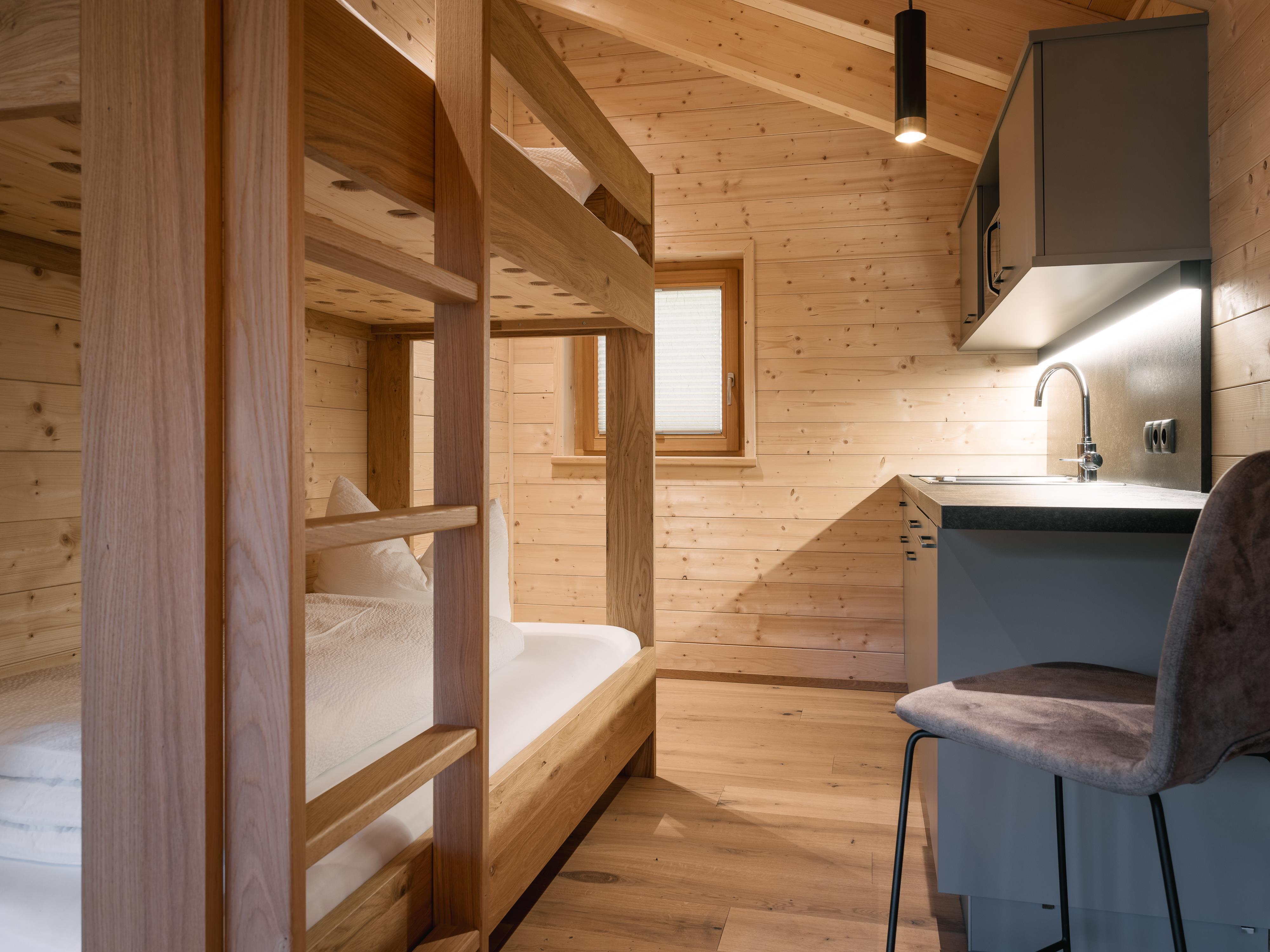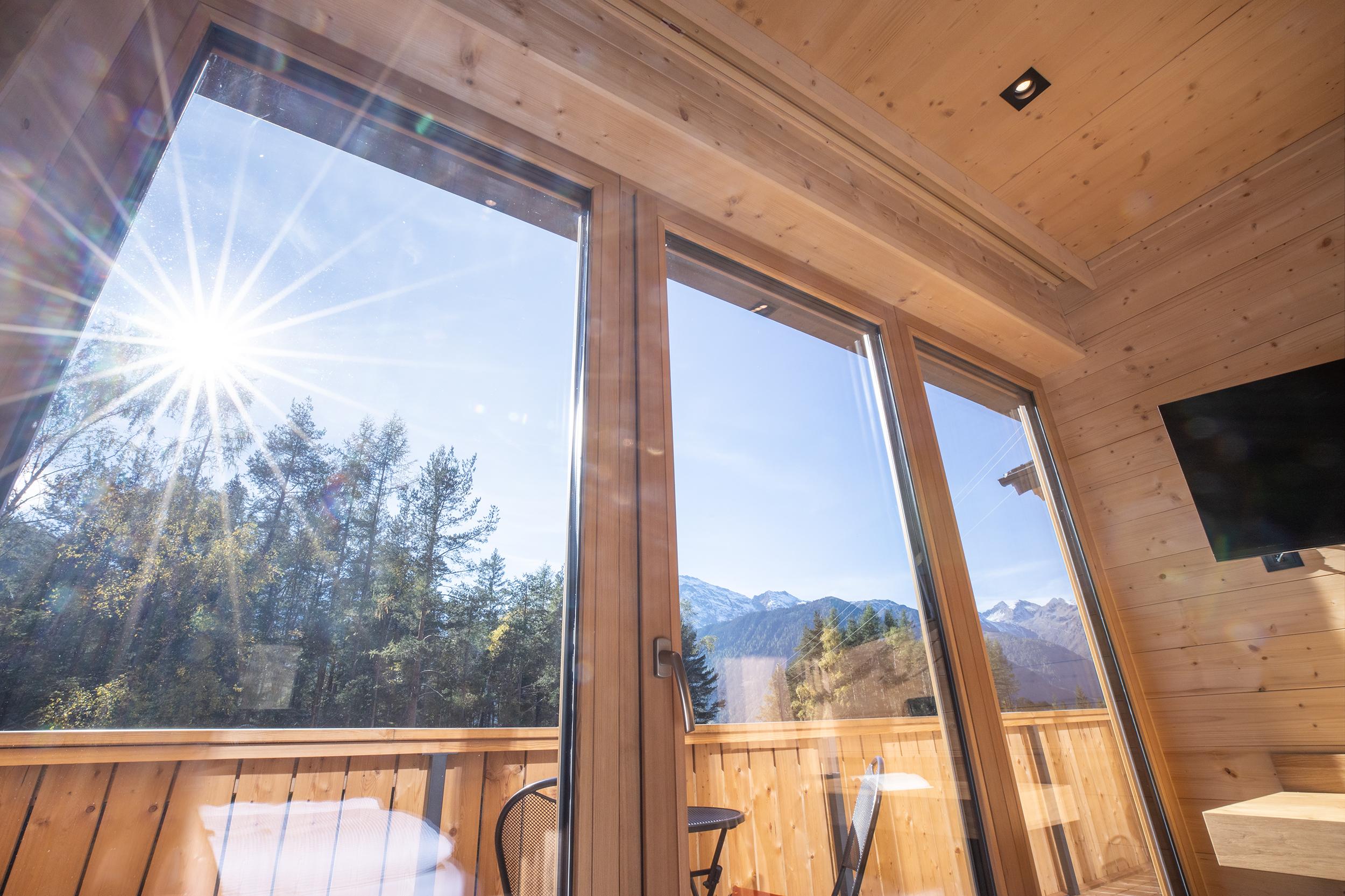 Das Chalet Familien mit ca. 150 m² besteht aus: 1 Panoramazimmer mit Kochnische, Doppelbett und Stockbett sowie eigenem Badezimmer mit WC und Dusche, 2 Doppelzimmer mit jeweils eigenem Bad, WC und Balkon. Im Erdgeschoss befindet sich eine geräumige Wohnküche mit vollausgestatteter Küchenzeile, großem Tisch, Wohnbereich mit TV. Zugang zur privaten Wohlfühloase mit Sauna, Infrarotkabine und Dusche, große Terrasse mit süd-west Blick, Tisch und Bänke aus Massivholz und Liegestühle
