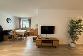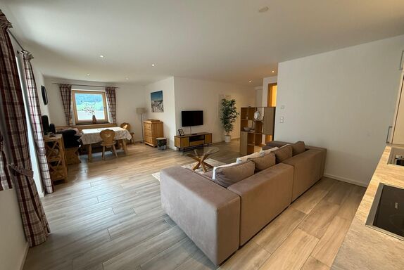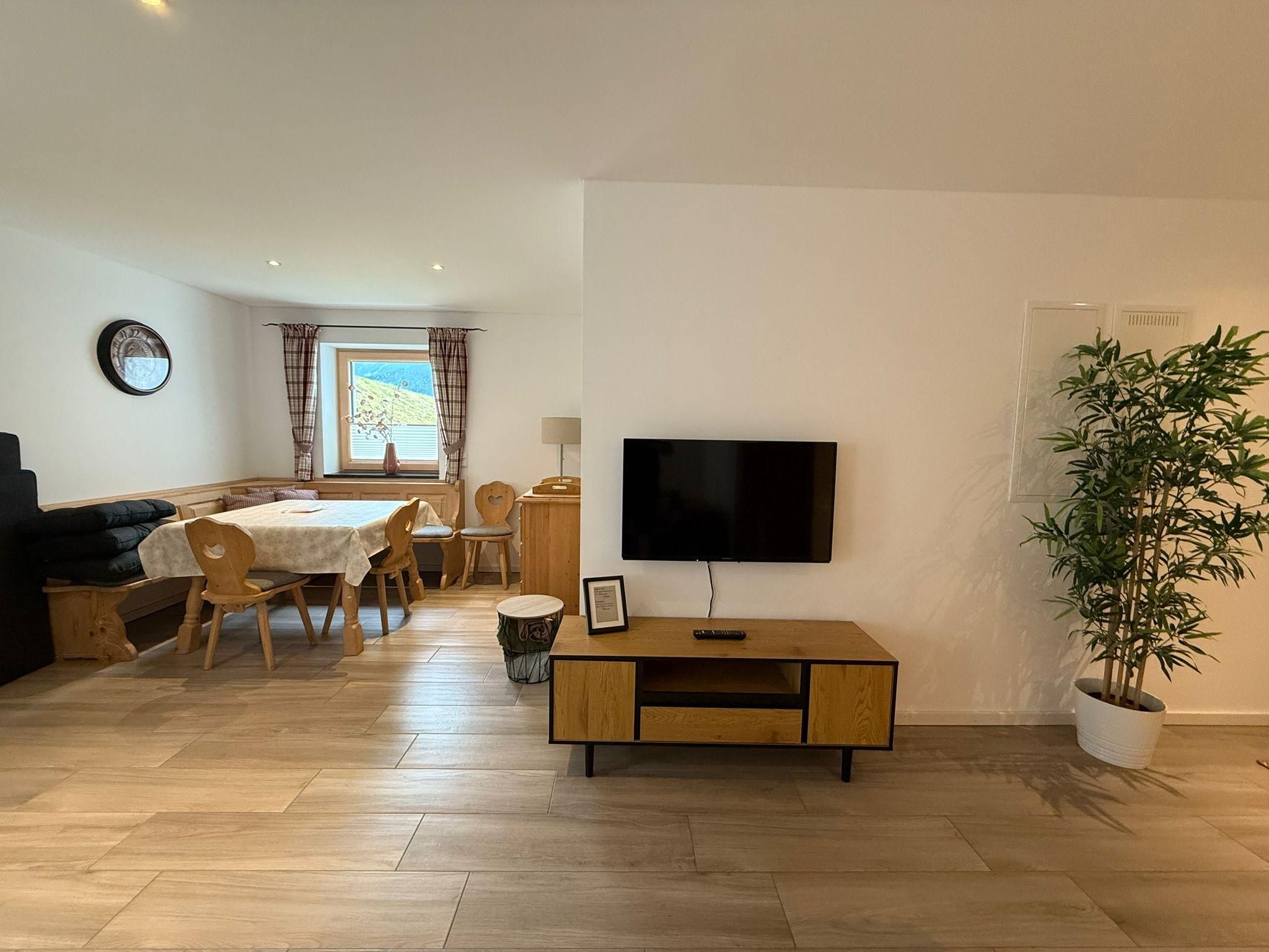 Wohn/Esszimmer mit Flat-TV mit Couch, Esstisch mit Eckbank