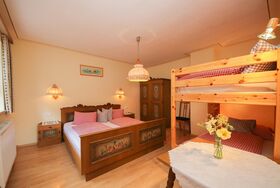 Sehr schönes Familien-Appartment für bis zu 6 Personen. Neben einem großen Schlafzimmer mit einem Doppelbett und einem zusätzlichen Etagenbett für 2 Kinder findet sich im angrenzenden Wohnzimmer noch eine Schlafcouch für bis zu 2 Personen. Außerdem bietet dieses Appartment eine Küche mit separatem Essbereich sowie Zugang zu einer großen überdachten Terasse zur alleinigen Nutzung. Zusätzlich verfügt die Wohneinheit noch über ein Badezimmer mit Dusche und ein separates WC. Optional kann zu diesem Appartement ein angrenzendes Doppelzimmer mit Dusche und WC dazu gebucht werden.