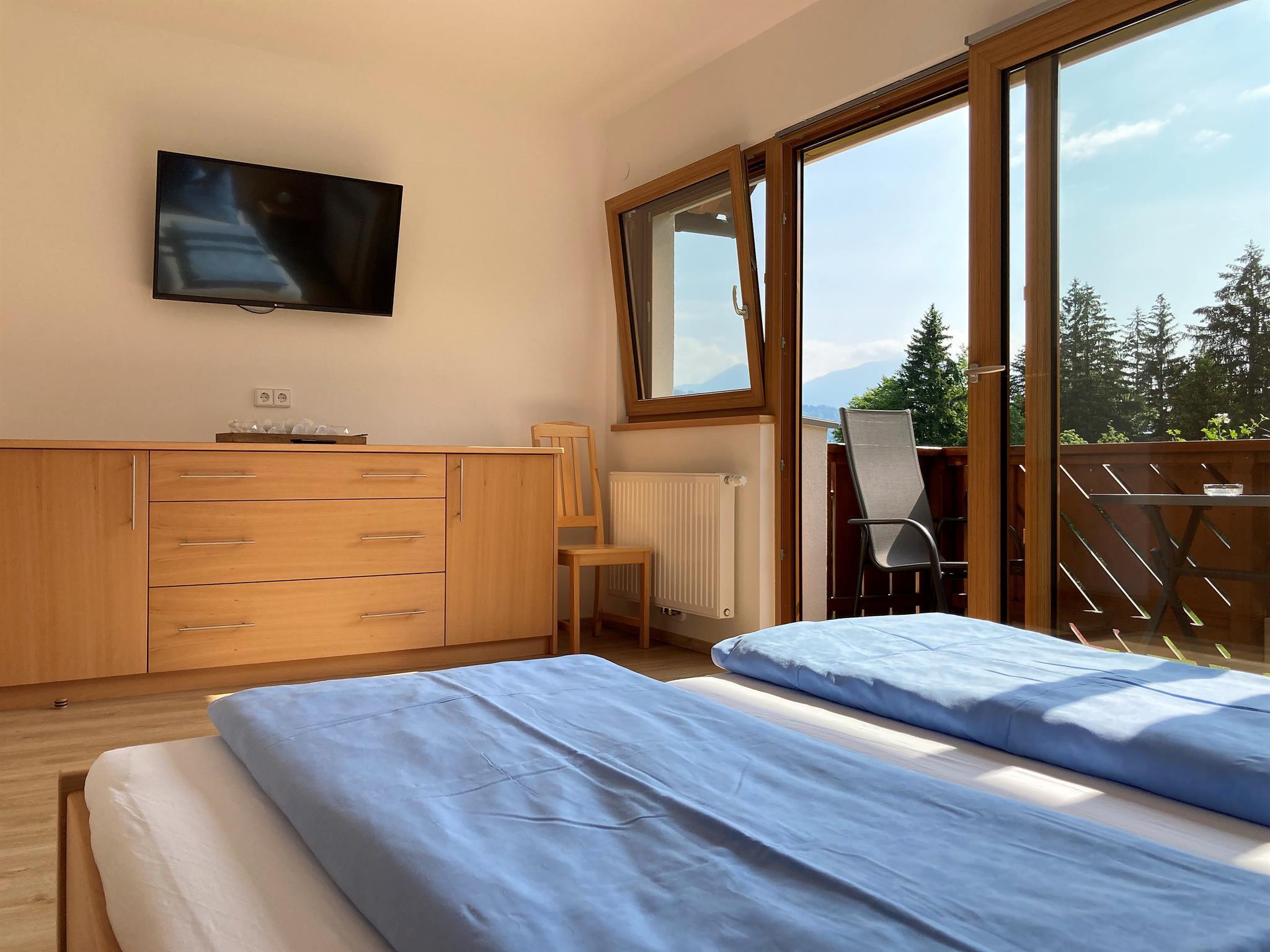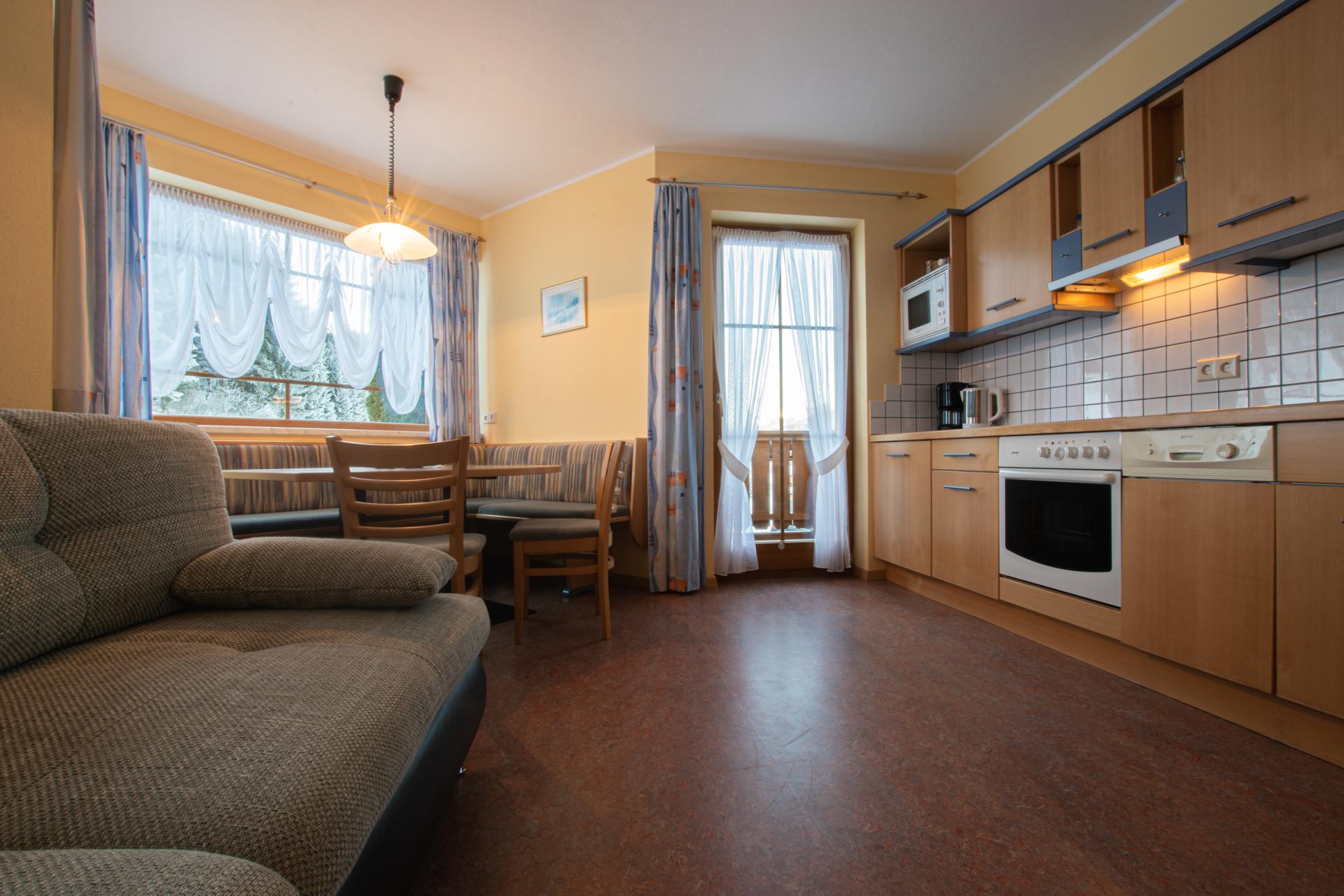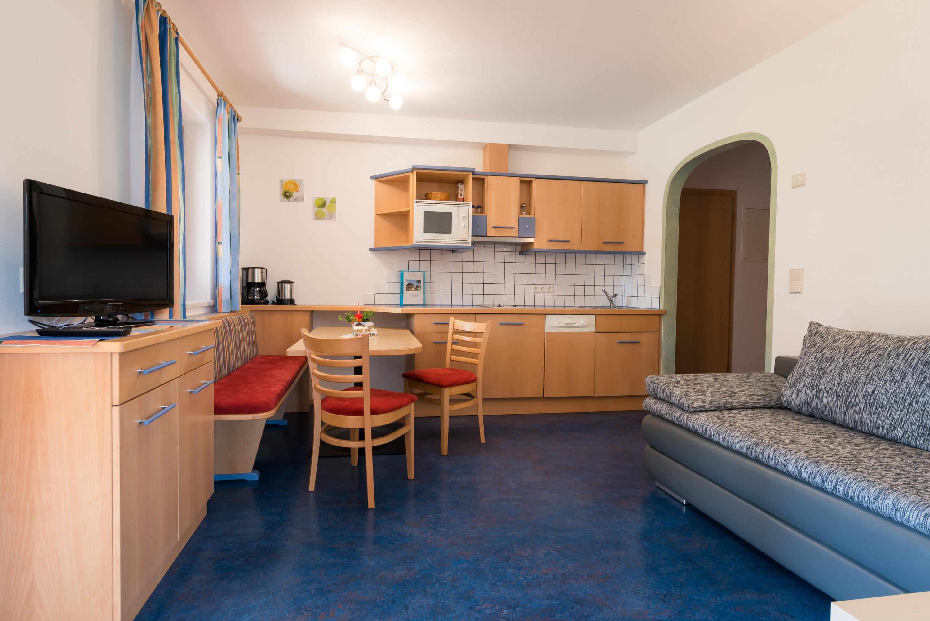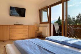 Gemütlich eingerichtetes 3-Raum Appartement NEU seit 1. Juni 2021 mit 2 Schlafzimmern mit Doppelbetten (+ Zustellbett oder Gitterbett) für 2-5 Personen, Küche mit Ausziehcouch (Induktionskochfeld mit 4 Kochstellen, Geschirrspüler, Kaffeemaschine, Heißluft Mikrowelle, Wasserkocher, 2x Dig-TV, W-Lan), Dusche mit Föhn (Badezimmergröße unterschreitet den 4 Sterne Standart), WC, Vorraum und Balkon.