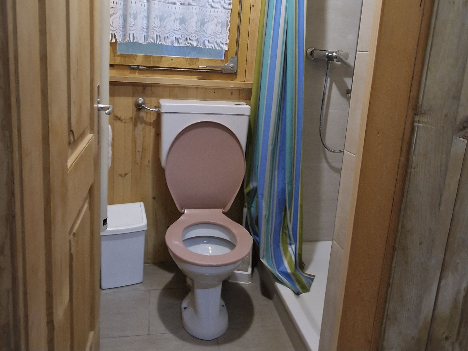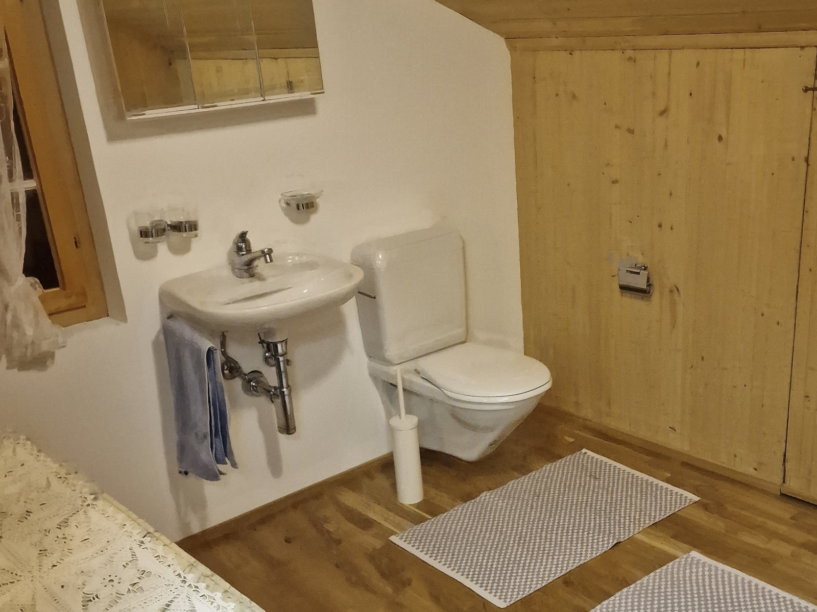 WC/Dusche mit Lavabo ausserhalb des WC's im unteren Stock und ein WC/Lavabo im oberen Stock. Frotteewäsche vorhanden und im Preis inbegriffen.