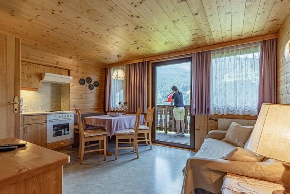 Ferienwohnung „Tanne“ – Rückzugsort mit alpinem Flair Die Ferienwohnung Tanne bietet ca. 55 m² Wohnfläche und eignet sich ideal für bis zu 4 Personen. Sie verfügt über ein separates Schlafzimmer, einen großzügigen Wohn-Essbereich mit ausziehbarem Sofa, eine voll ausgestattete Küche sowie ein modernes Badezimmer mit Dusche und WC. Naturholz, harmonische Farben und viel Licht sorgen für ein behagliches Wohngefühl. Der Balkon eröffnet einen weiten Blick auf die Berge – perfekt für alle, die Ruhe, Natur und echten Komfort schätzen.