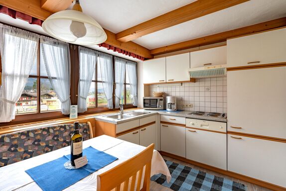Genießen Sie von der Küche den Blick auf den Wilden Kaiser oder verfolgen Sie im Winter wie Ihre Kleinsten auf der Übungswiese das Skifahren lernen. Im Sommer lädt unser gepflegter Garten zum Entspannen ein.