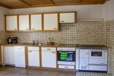 Wohnküche: Elektroherd mit Backofen, Geschirrspüler, Wasserkocher, Kaffeemaschine sowie Kühlschrank mit Gefrierfach
