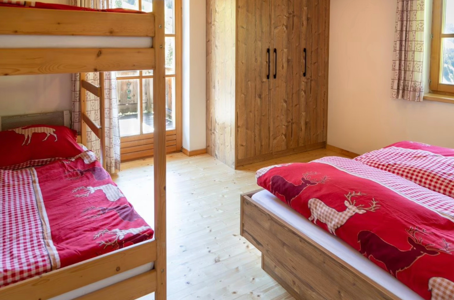 1 Schlafzimmer mit Doppelbett und Stockbett