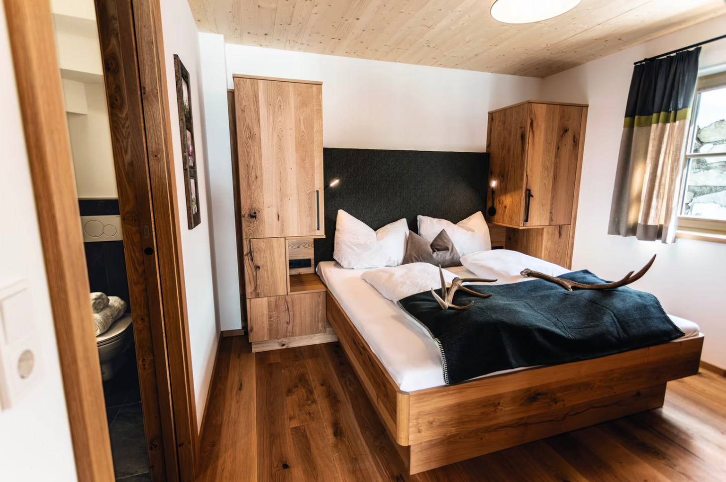 1 Zimmer mit Doppelbett und angrenzendem separaten Zimmer mit Stockbett im OG