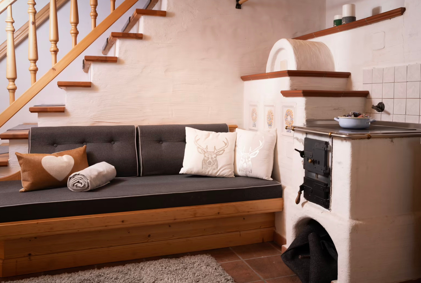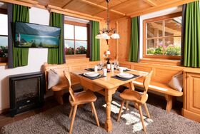 Wohnküche mit gemütlicher Essecke und Kachelofen