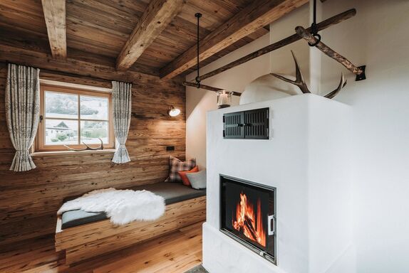 * Wohn- und Essbereich mit Kachelofen und gemütlichem Kanapee, Kabel-Flat-TV