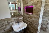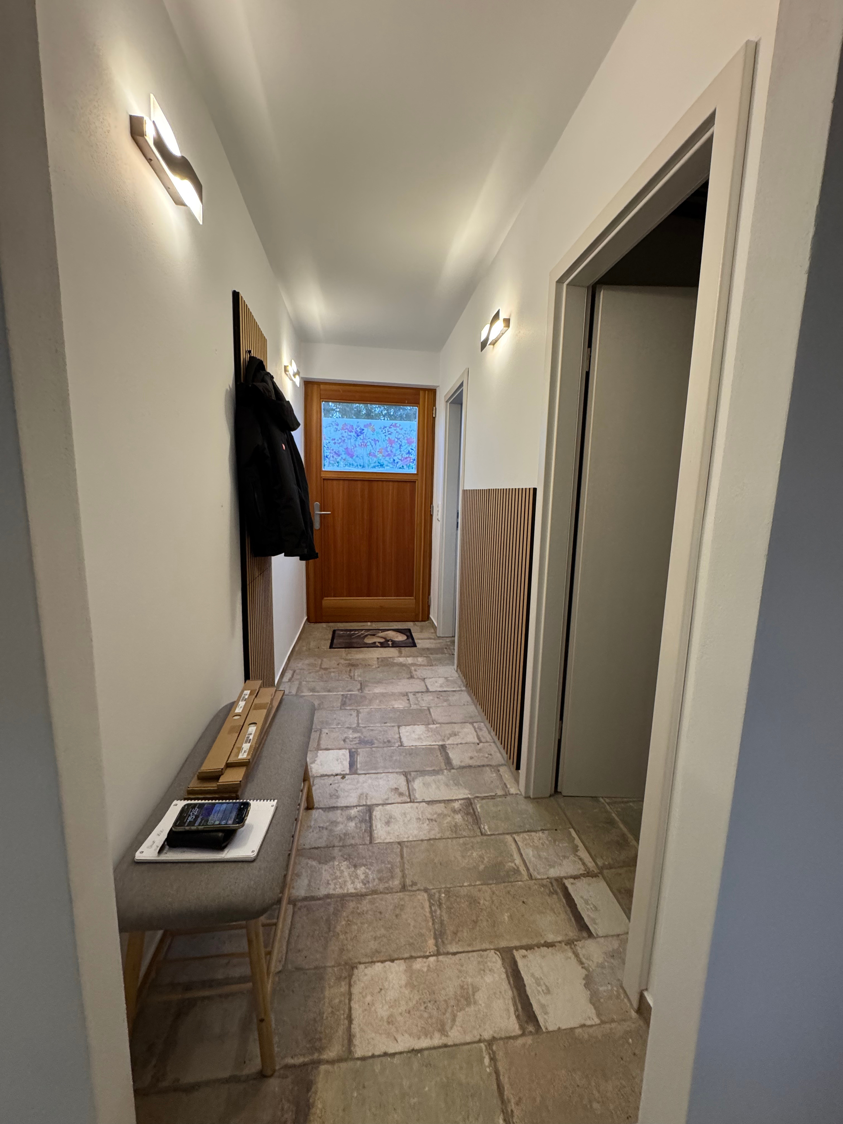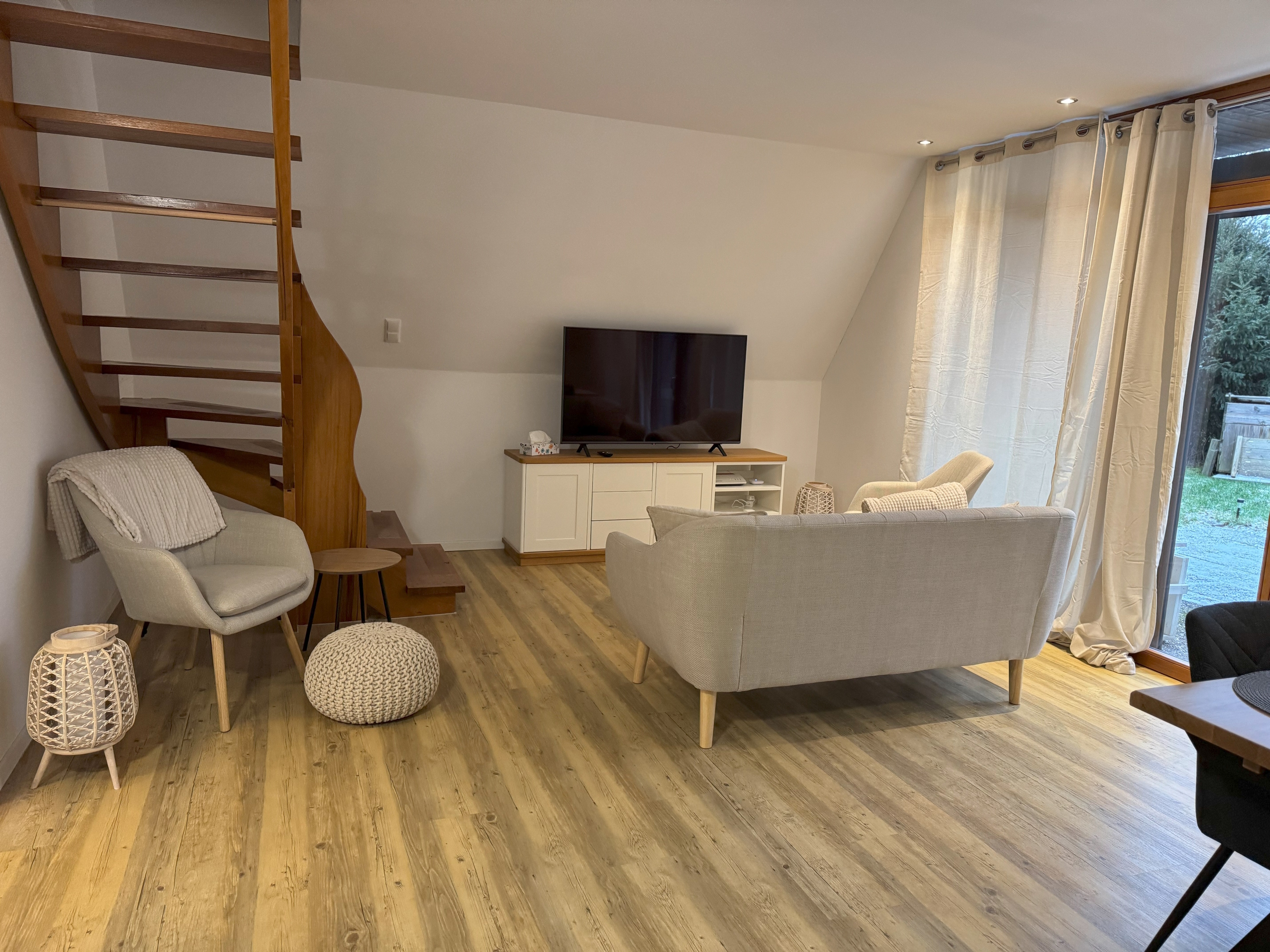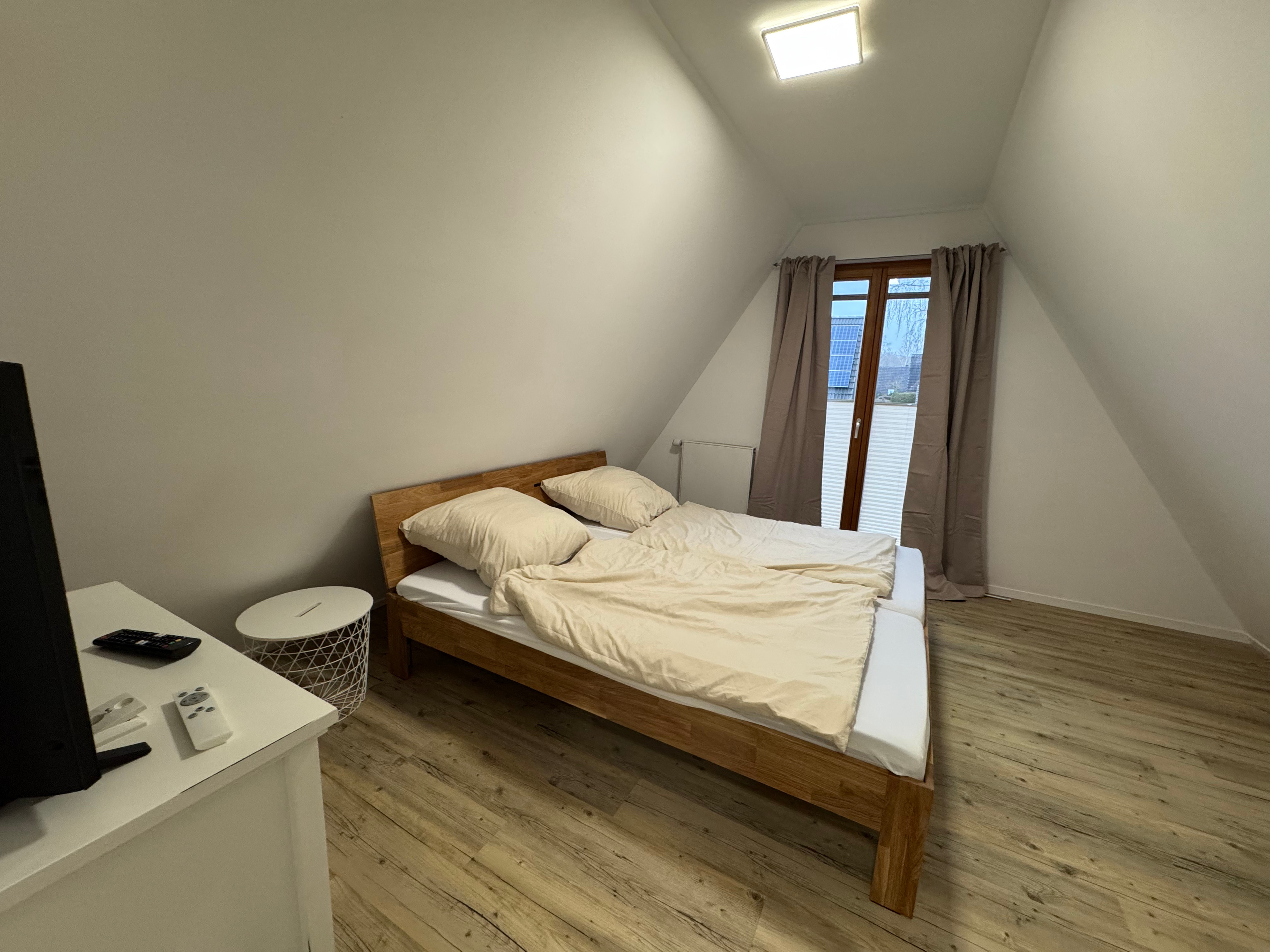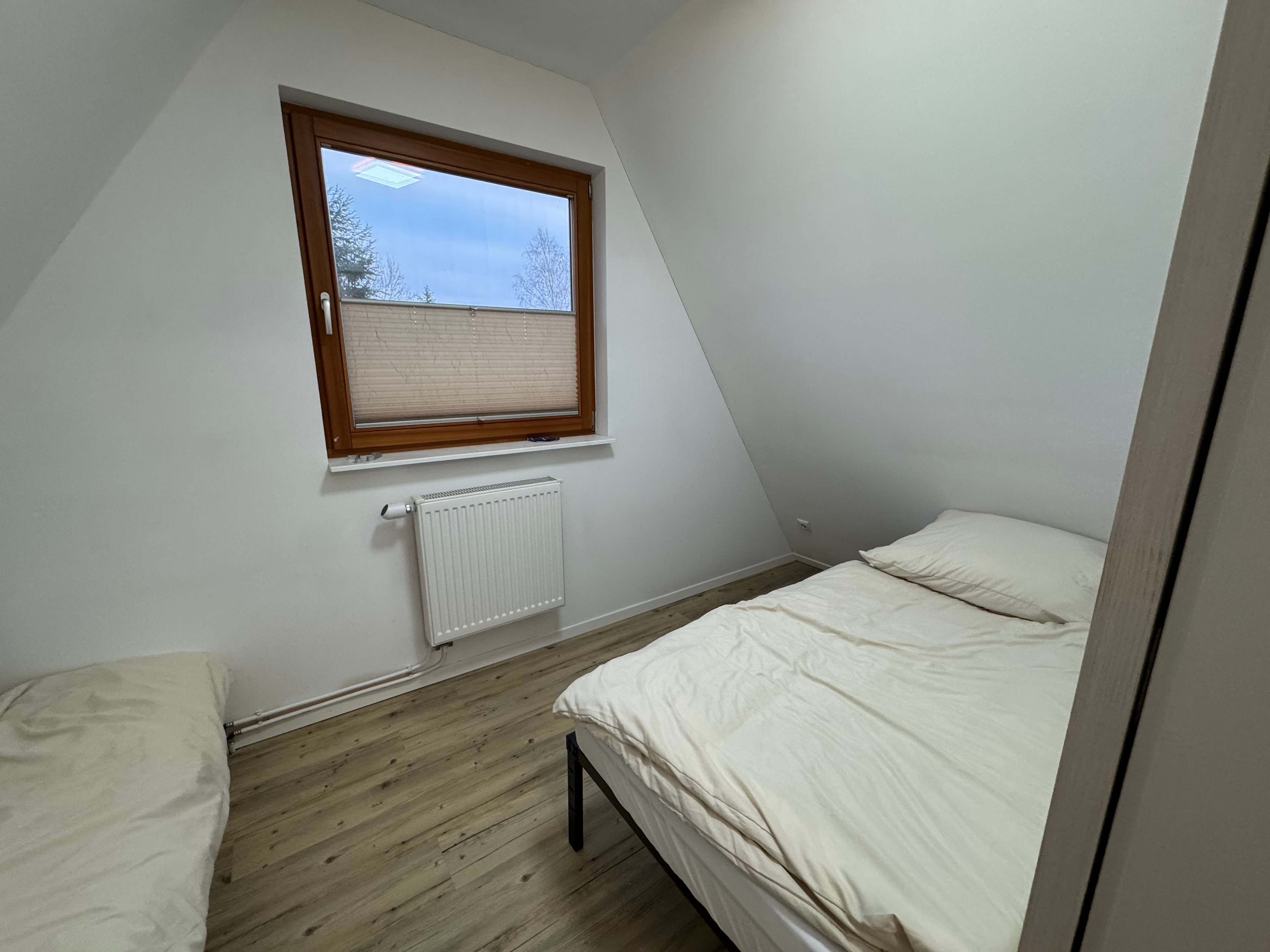 Das Ferienhaus bringt nicht nur eine außergewöhnliche Architektur mit sich, sondern besticht auch durch den renovierten Innenraum. Im Erdgeschoss findet sich ein großer Wohn-, Essraum mit Panoramafenster in den Garten. Außerdem gibt es ein neu renoviertes Badezimmer mit begehbarer Dusche. Über eine offene Treppe im Wohnzimmer gelangt man in das Obergeschoss. Hier finden sich zwei Schlafzimmer mit insgesamt vier Schlafmöglichkeiten (ein Babybett kann zusätzlich mit dazu gestellt werden). Im Obergeschoss ist ein weiteres Badezimmer vorhanden.