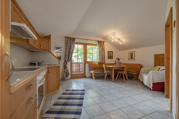 Die Ferienwohnung Winter bietet auf ca. 60 m² Platz für bis zu 4 Personen und begeistert mit heimeliger Atmosphäre und liebevoller Ausstattung. Sie verfügt über zwei getrennte Schlafzimmer, einen offenen Wohn- und Essbereich mit voll ausgestatteter Küche sowie ein modernes Badezimmer mit Dusche und WC. Helle Holzmöbel, warme Farben und natürliche Materialien schaffen ein behagliches Wohngefühl. Vom Balkon aus genießen Sie einen herrlichen Blick auf die verschneite Bergwelt des Lesachtals – ideal für entspannte Wintertage in familiärer Umgebung.