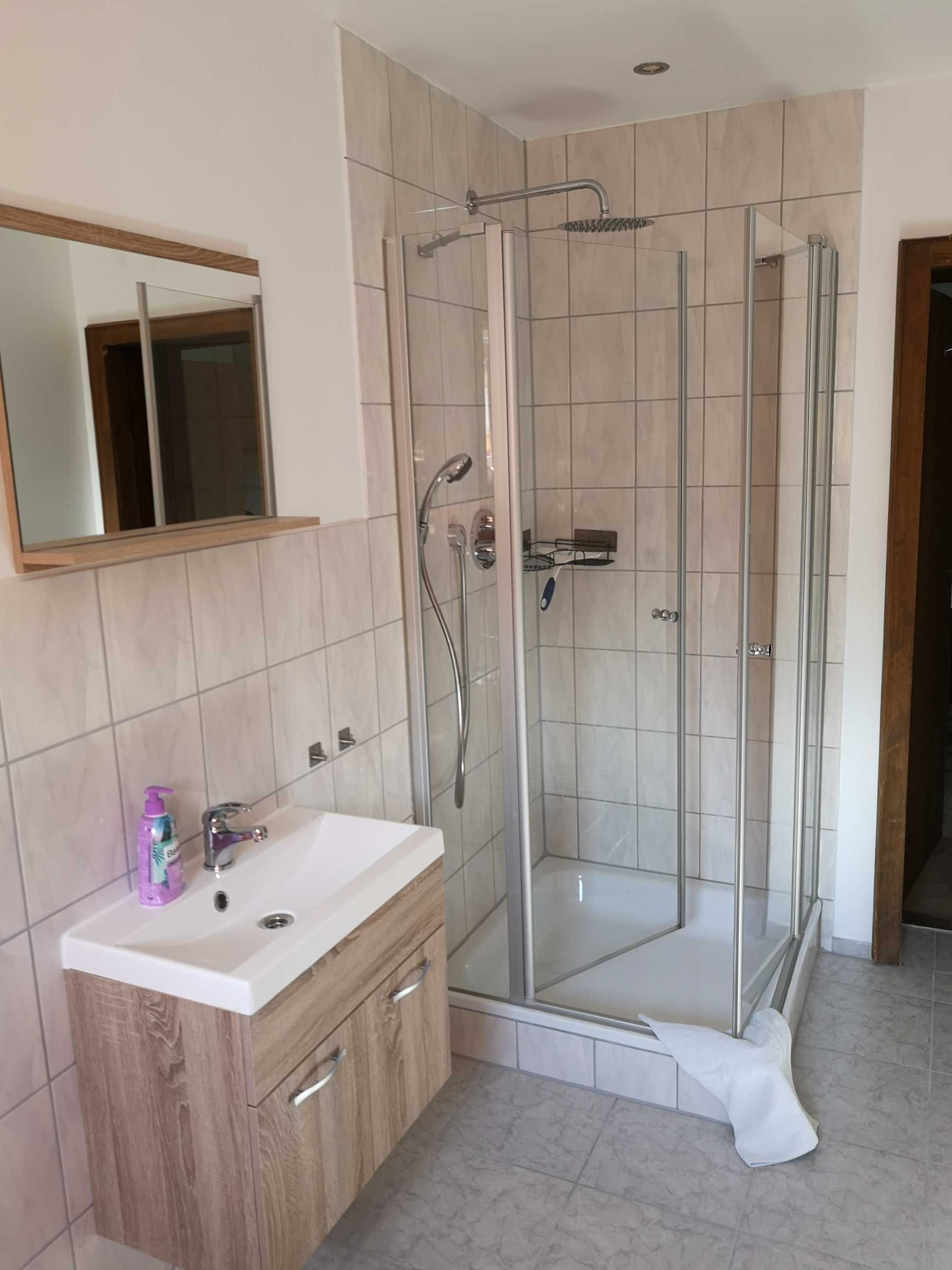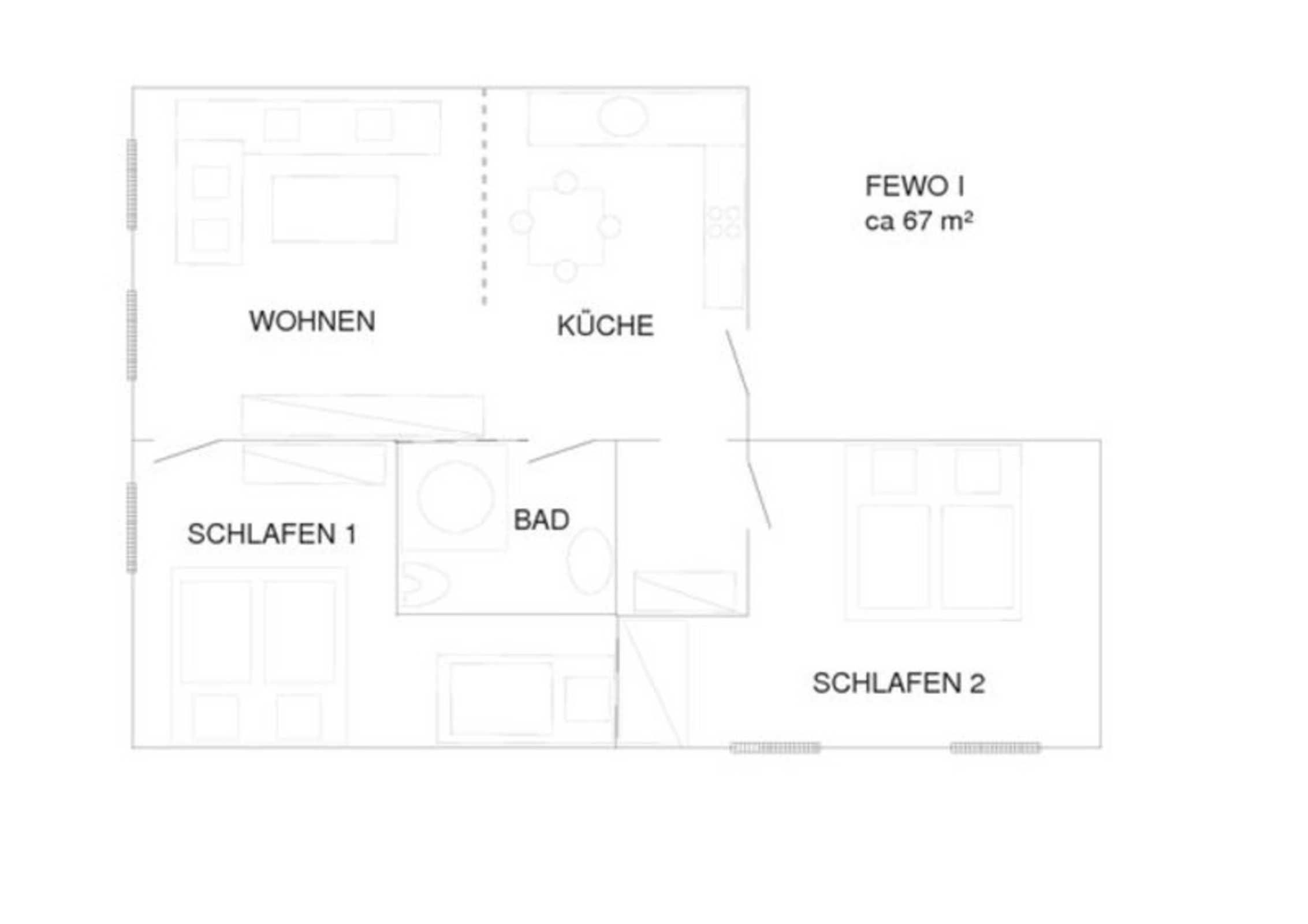 gemütliche Wohnung mit zwei Schlafzimmern, Wohnzimmer mikt Schlafcouch u. Küche, Badezimmer mit Wanne, Dusche und WC.