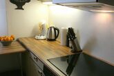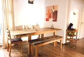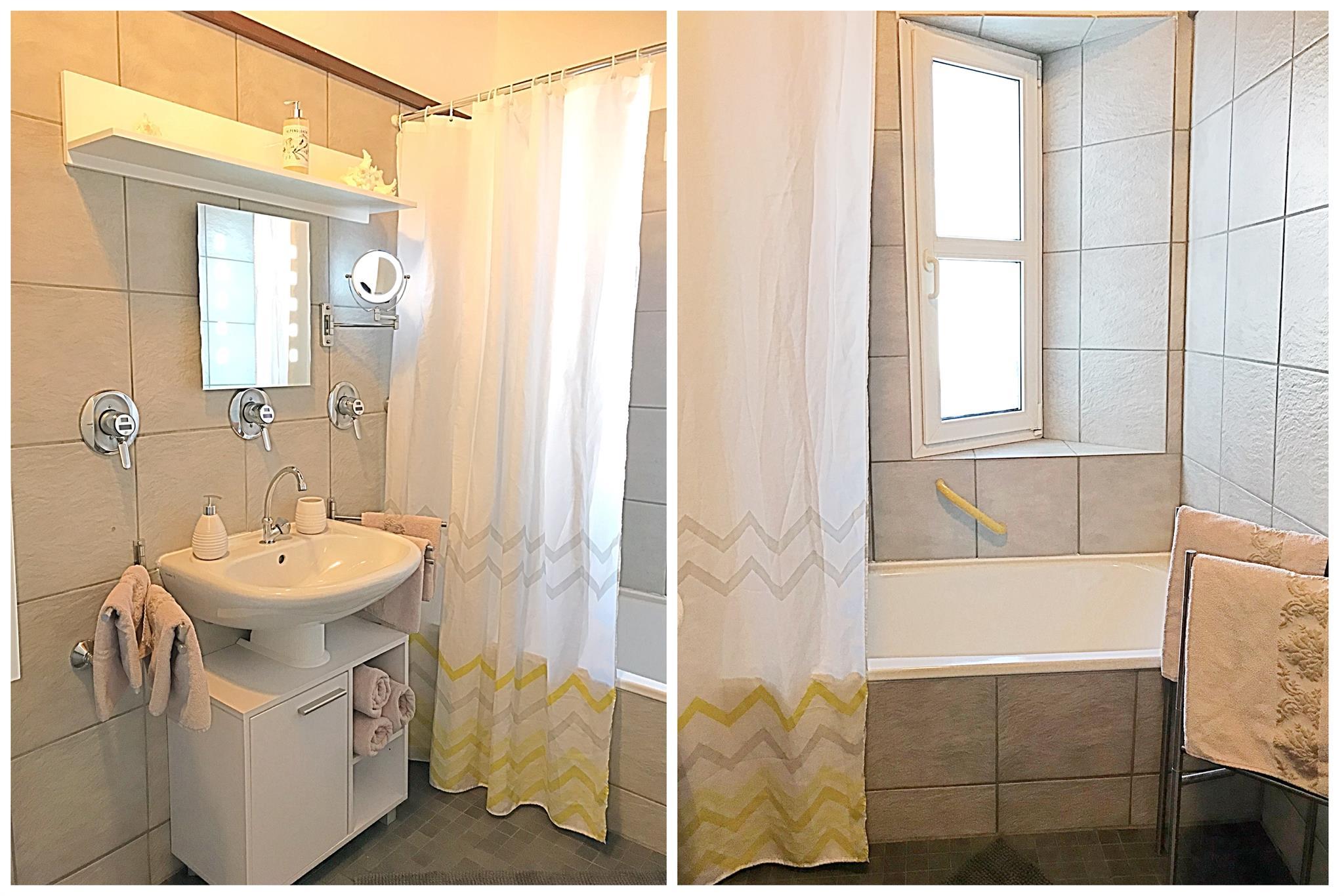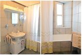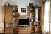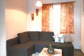 Im Wohnzimmer ermöglichen eine Wohnwand im Landstil, Fernseher, CD-Anlage und Sofa einen gemütlichen Zeitverbleib. Die Essecke befindet sich neben der großen Fensterwand, die auf die 35 qm große sonnige Terrasse führt. Bad und Toilette sind getrennt.