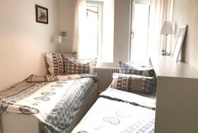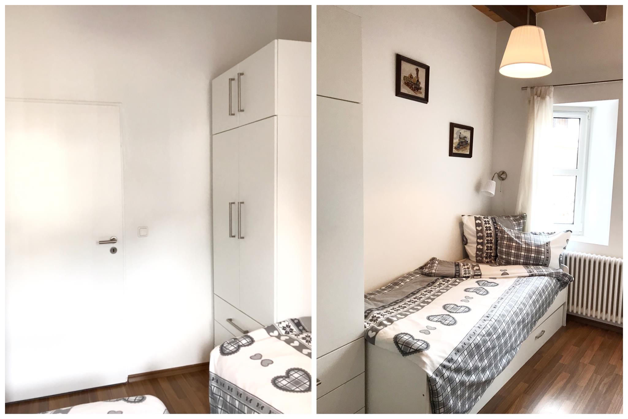 Ein großes Schlafzimmer ist mit einem Doppelbett, Nachtkästchen und einem Schrank ausgestattet. In kleinerem Schlafzimmer steht ein Einzelbett, welches unten zum weiterem Schlafplatz ausgezogen werden kann, und eine Kommode.