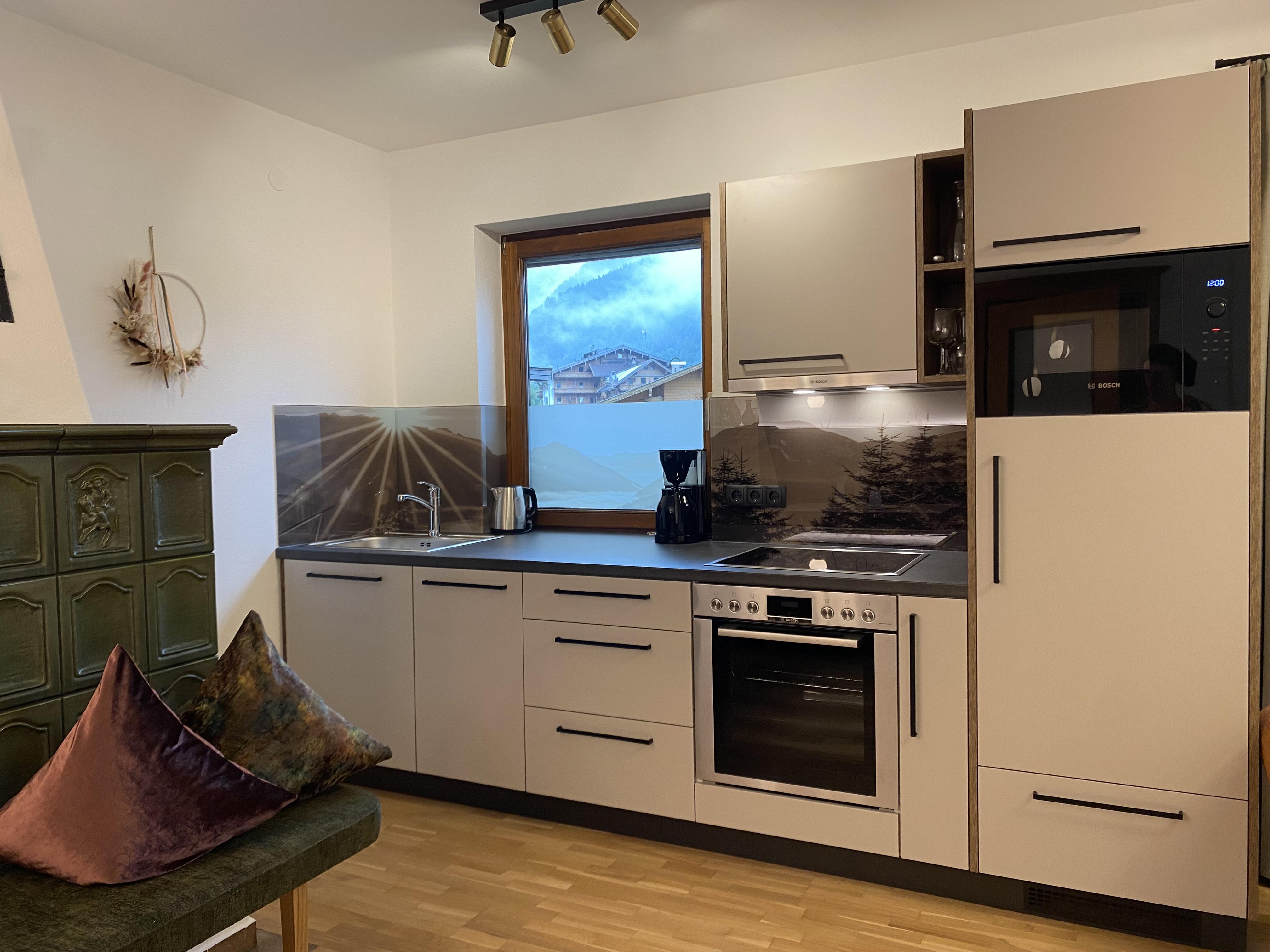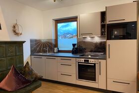 Hell. Sonnig. Familiär. Ferienwohnung 65m² für 2-5 Personen. 2 Schlafzimmer, gemütlicher Wohnraum mit Kachelofen, Sitzgarnitur, komplett ausgestattete Küche mit Essecke. Bad mit Dusche, separates WC. Herrlicher Panorama-Südbalkon (Sonnenseite).