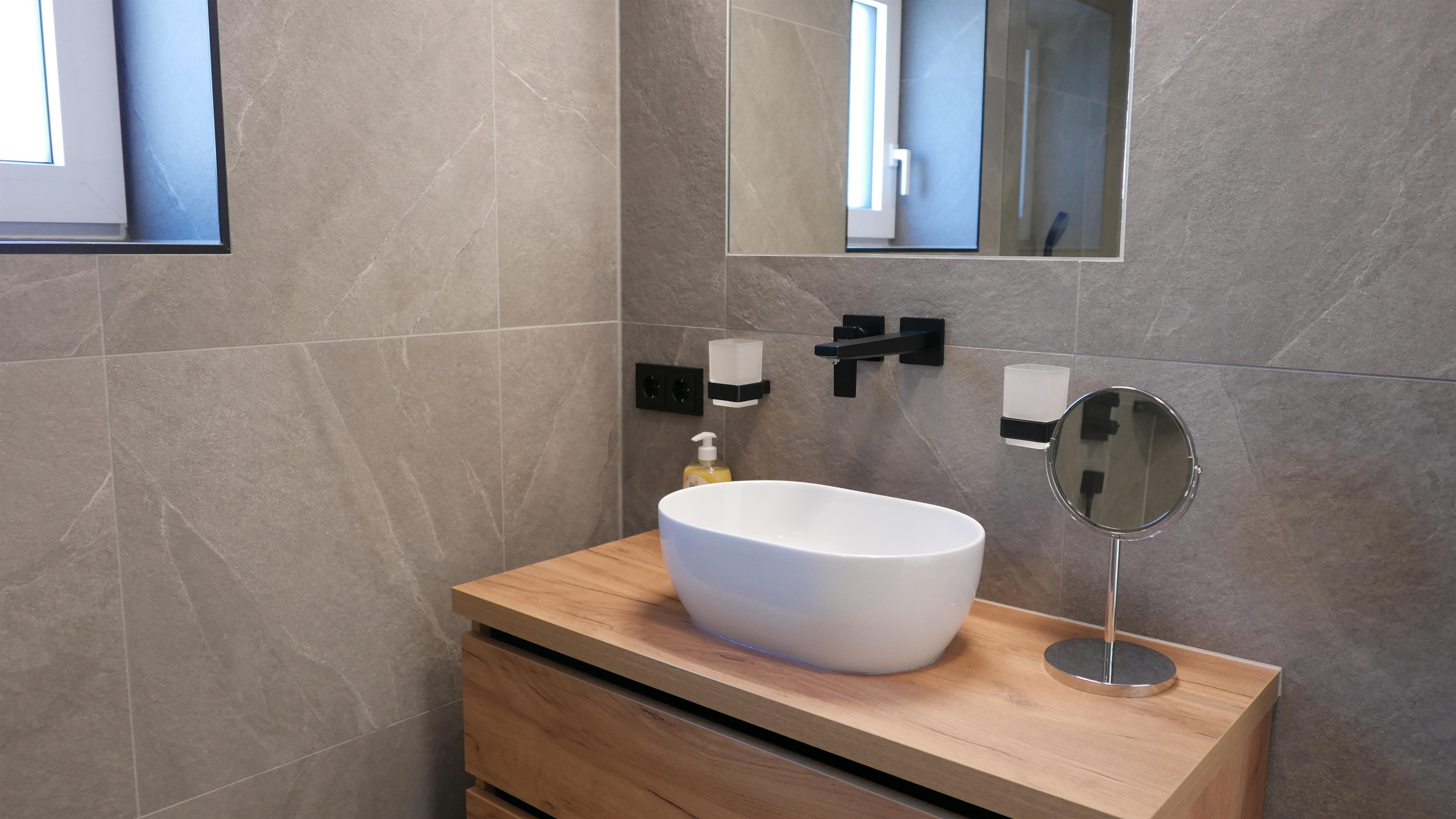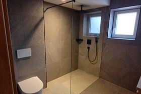 Das moderne Badezimmer ausgestattet mit einer Dusche und WC.