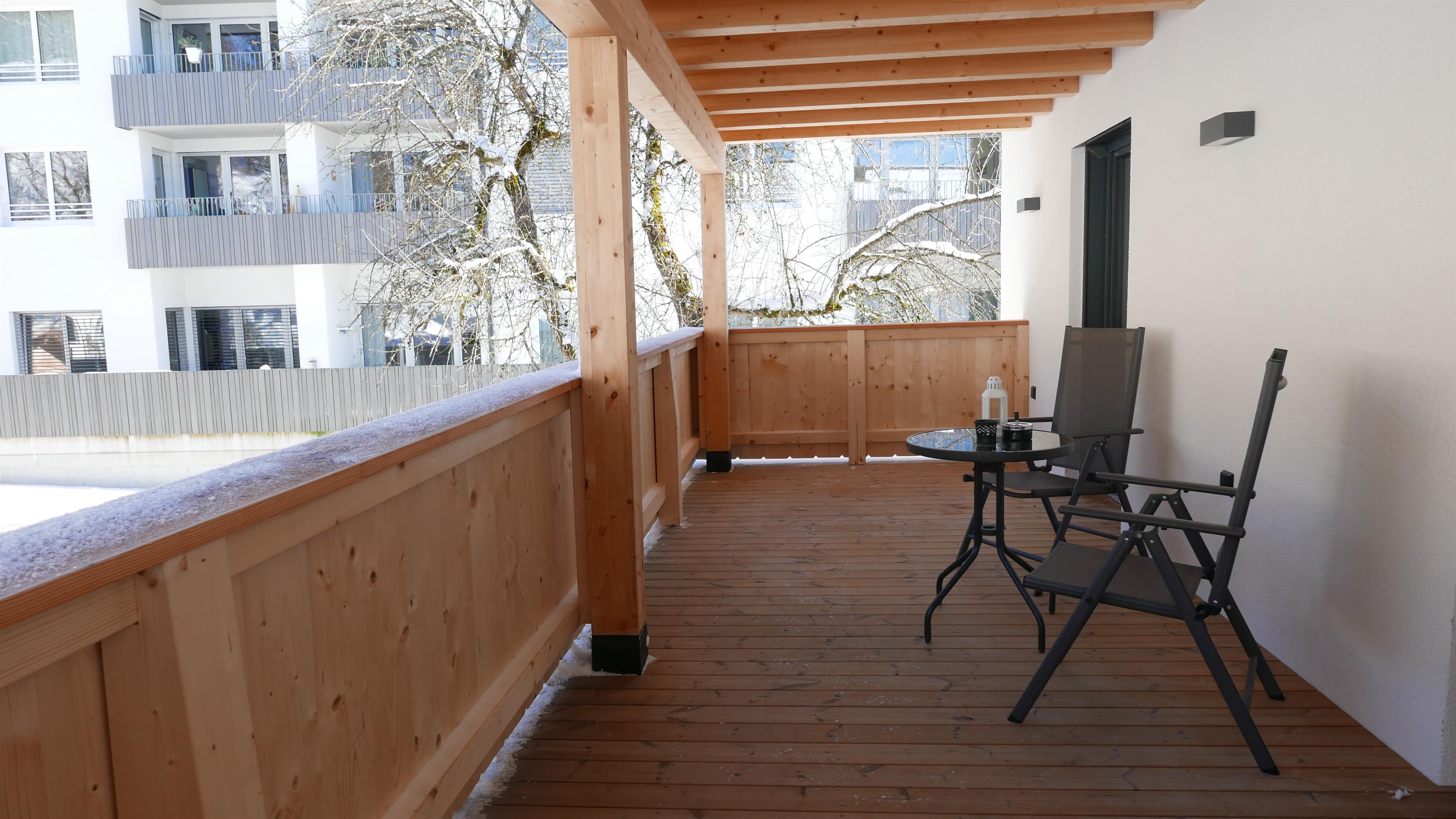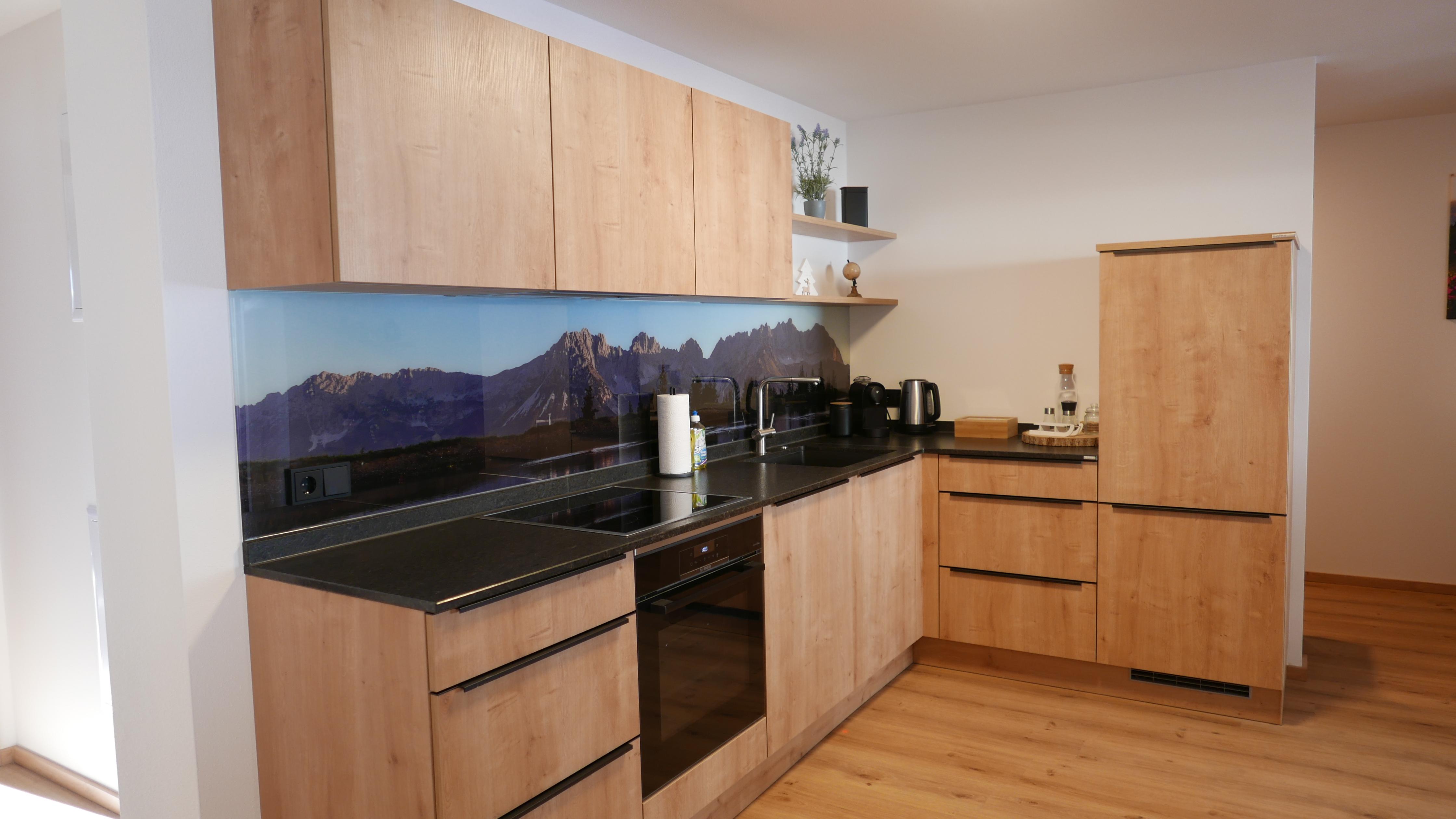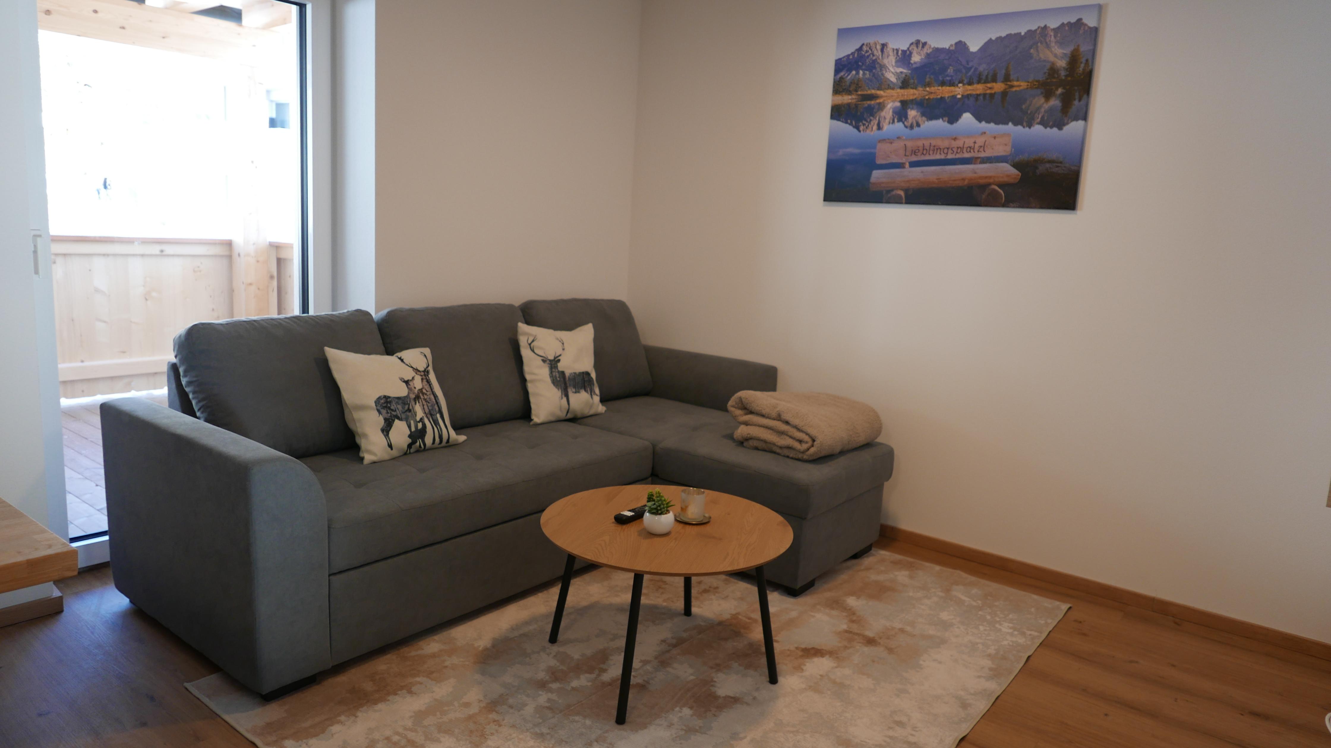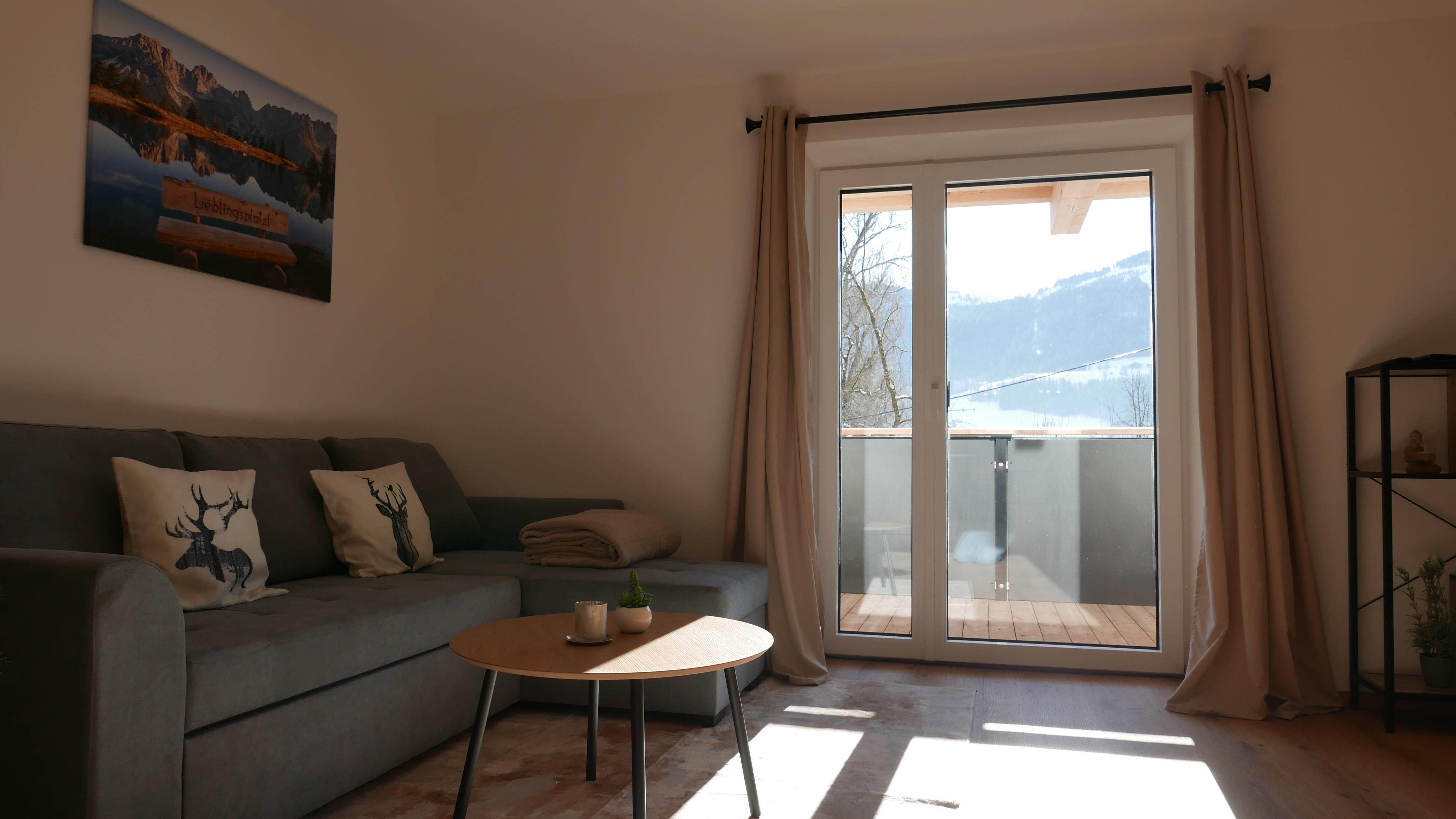 Unser großzügiger Wohnbereich lädt zum Verweilen ein und bietet eine Küche im Landhausstil. Entspannen Sie auf der bequemen Couch, die sich mühelos in ein Doppelbett verwandeln lässt. Auf den über 20m2 großen nördlichen Balkon können Sie einen atemberaubenden Blick auf den Wilden Kaiser genießen.
