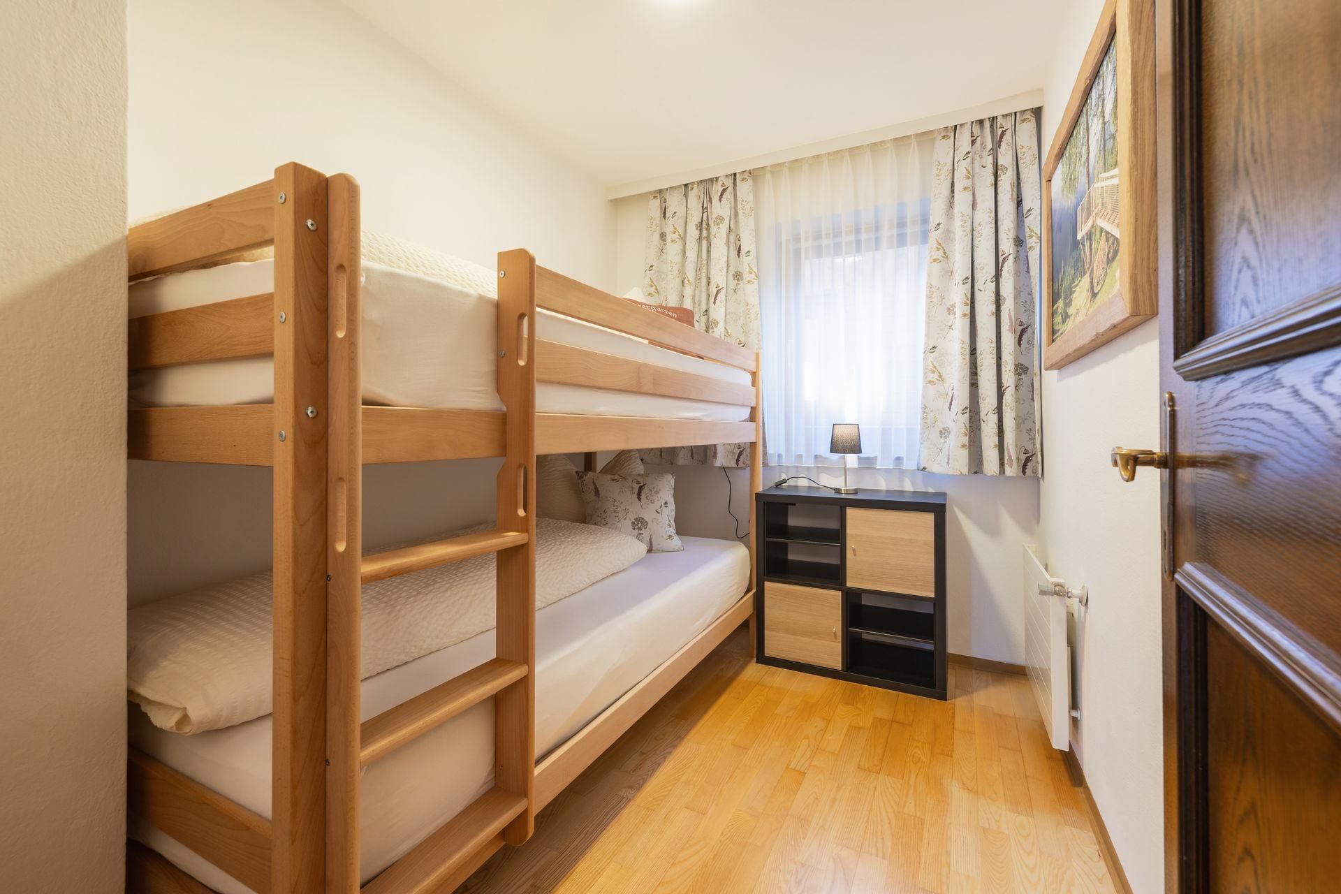 Die Ferienwohnung hat ein Schlafzimmer mit einem Doppel- und einem Einzelbett, eine Wohnküche mit einem Zusatzbett (140x200 cm, mit richtiger Matratze und richtigem Lattenrost), ein Badezimmer mit Dusche und WC.