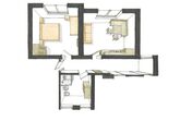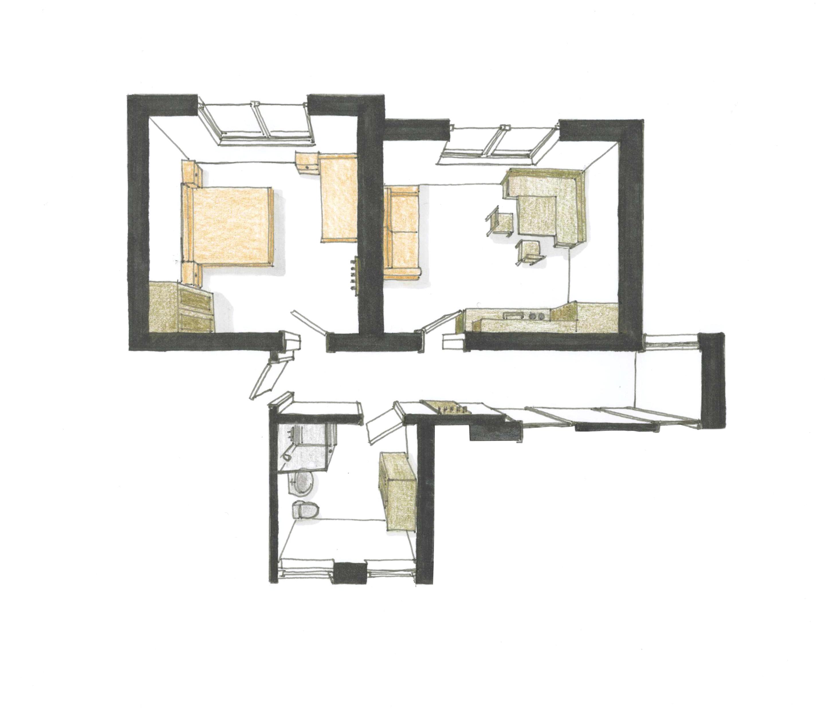 Die Ferienwohnung hat ein Schlafzimmer mit einem Doppel- und einem Einzelbett, eine Wohnküche mit einem Zusatzbett (140x200 cm, mit richtiger Matratze und richtigem Lattenrost), ein Badezimmer mit Dusche und WC.