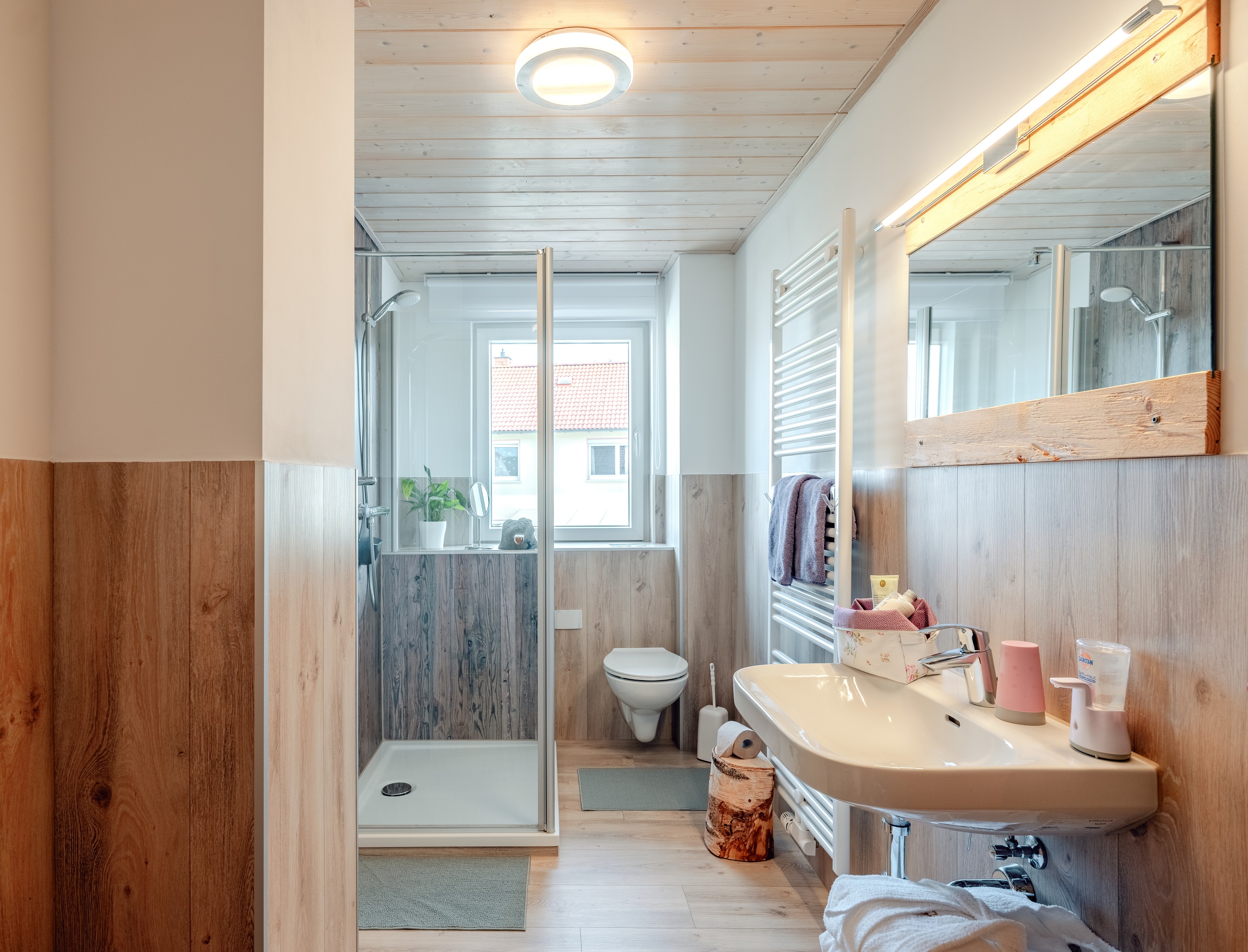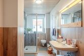 Dusche mit einer geringen Schwelle von ca. 5 cm, WC, Handtuchheizkörper, Kosmetikspiegel, Kinderschemel, großes Fenster, Föhn, Hand,- und Badetücher, welche im Preis mit inbegriffen sind.