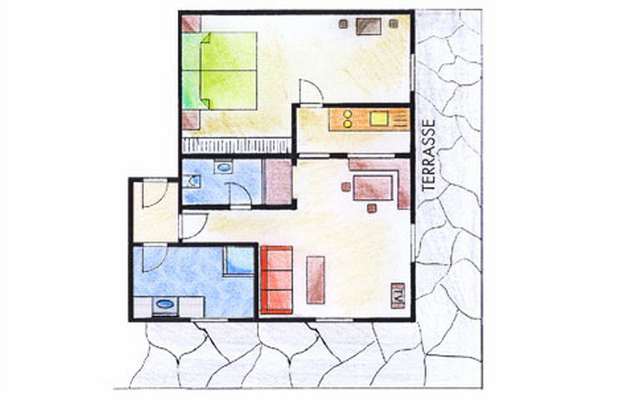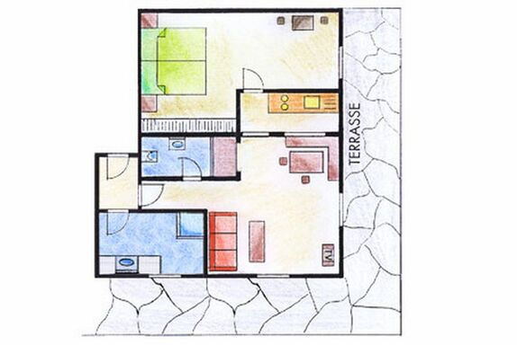 Die 46 qm-große, 4-Sterne-Wohlfühl-Ferienwohnung im Erdgeschoß für 2 Personen mit W-LAN, großer Terrasse und Garten verfügt über eine kleine Diele, ein Wohnzimmer mit Couch, Essecke mit Eckbank, SAT-TV und Stereo-Radio-DVD-Spieler sowie eine Küche mit Cerankochfeld, Mikrowelle, Spülmaschine, Kaffeemaschine und Wasser- und Eierkocher, ein geräumiges Schlafzimmer sowie Dusche und ein separates WC. Das Schlafzimmer ist sehr groß. Hier kann man bequem ein Zustell- oder ein Kinderbett aufstellen.
