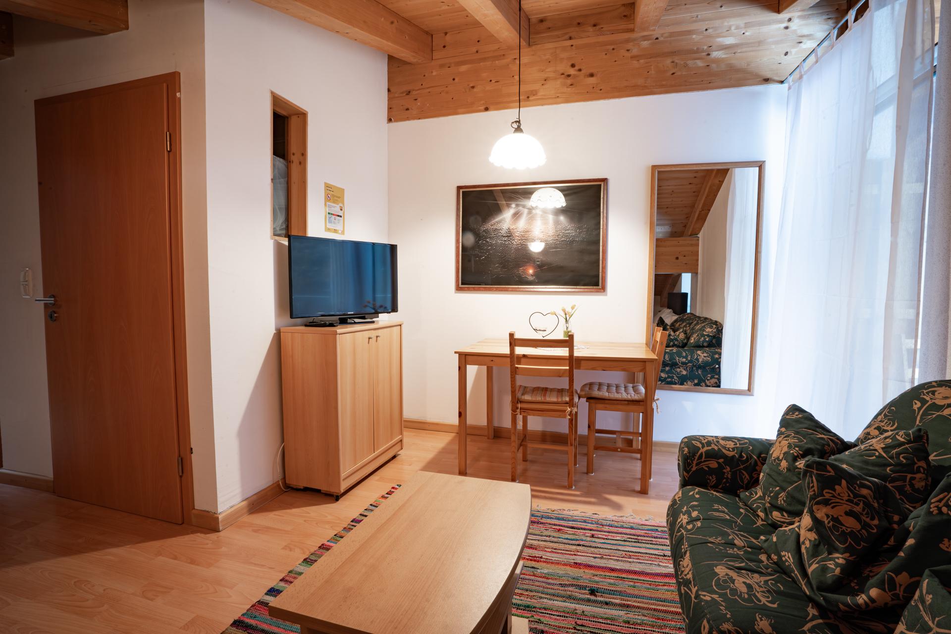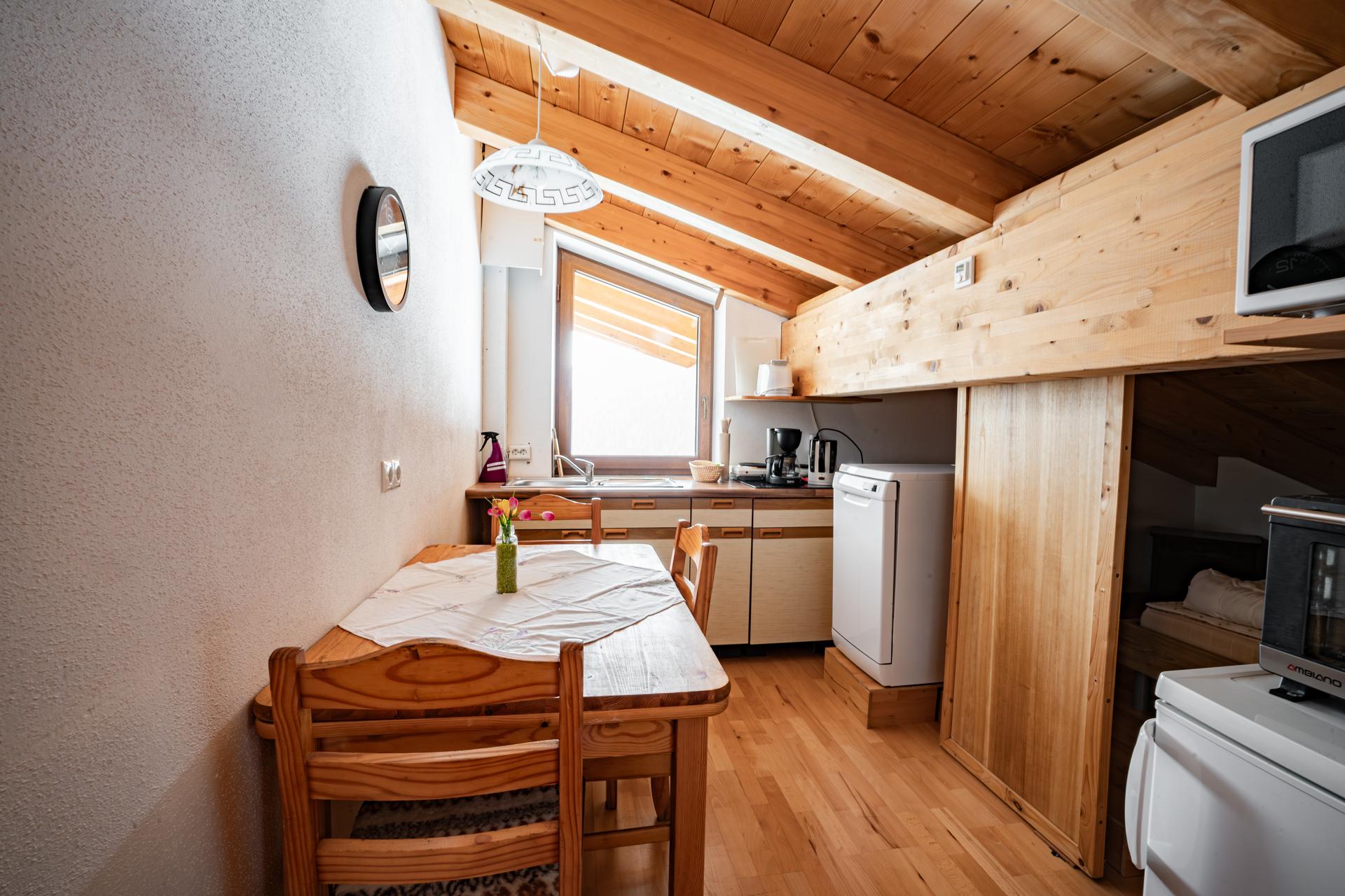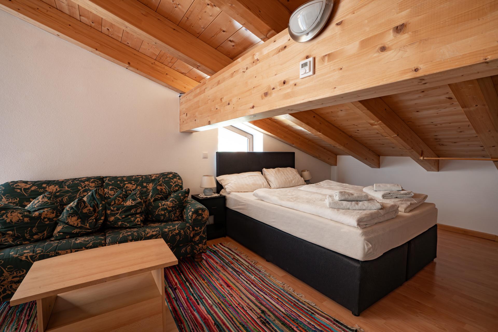 Mit einer Fläche von 24 m² bietet diese Wohnung einen Schlaf- und Wohnraum mit einem Doppelbett sowie eine separate Küche. Die Einrichtung folgt dem rustikalen Stil des Hauses und sorgt für eine warme und einladende Atmosphäre. Obwohl kleiner, ist diese Wohnung perfekt für Paare oder Einzelreisende, die eine komfortable und praktische Unterkunft in der Nähe der Natur suchen.