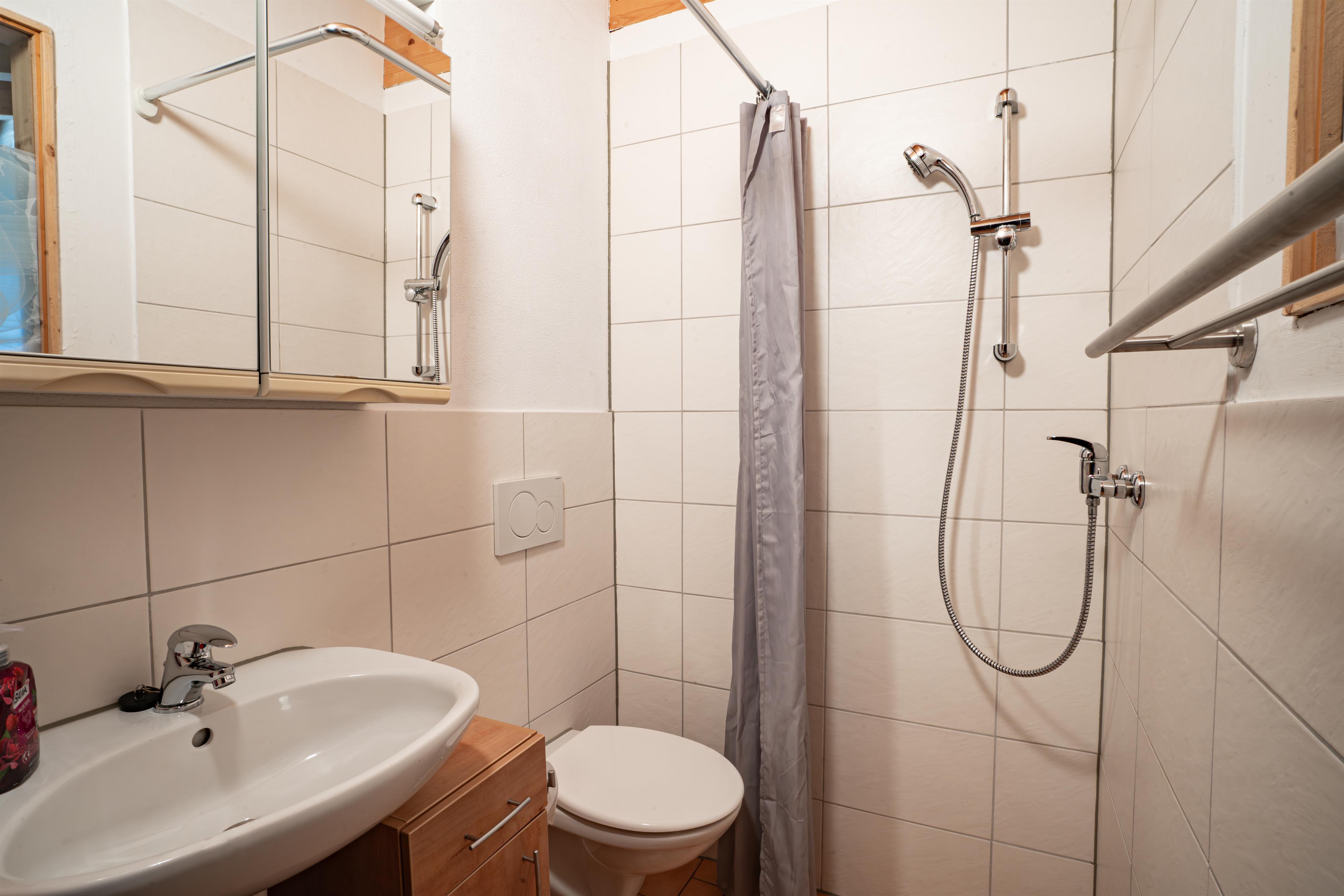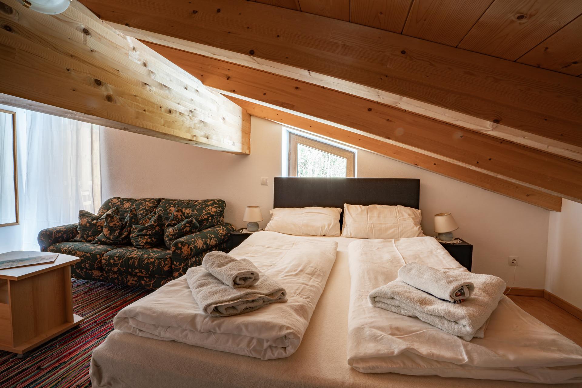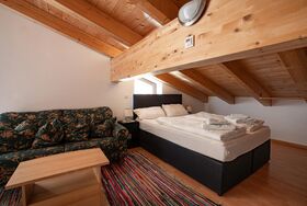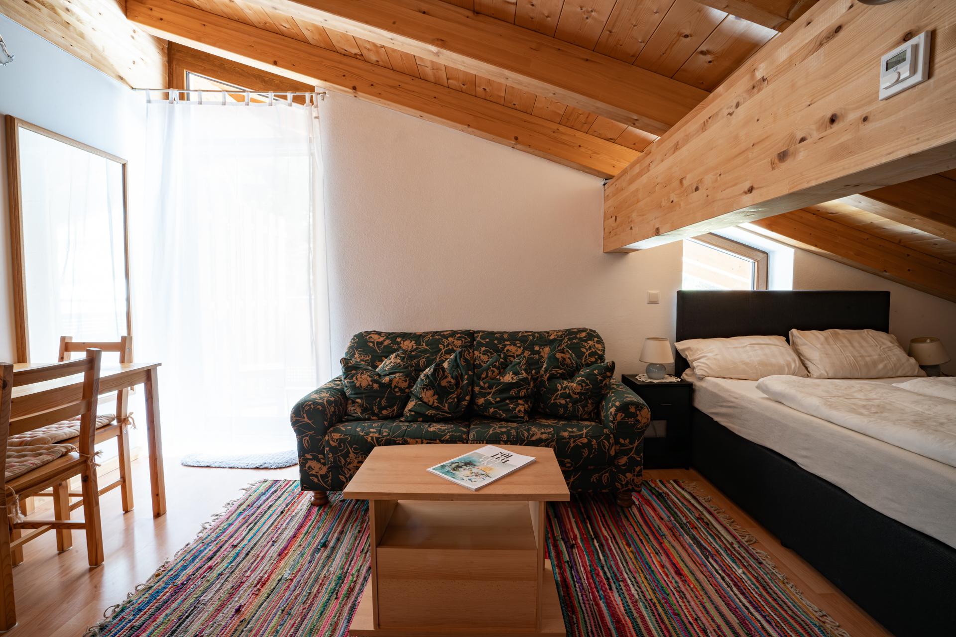 Mit einer Fläche von 24 m² bietet diese Wohnung einen Schlaf- und Wohnraum mit einem Doppelbett sowie eine separate Küche. Die Einrichtung folgt dem rustikalen Stil des Hauses und sorgt für eine warme und einladende Atmosphäre. Obwohl kleiner, ist diese Wohnung perfekt für Paare oder Einzelreisende, die eine komfortable und praktische Unterkunft in der Nähe der Natur suchen.