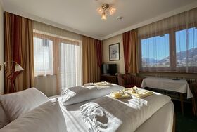Familienzimmer mit 1 großem Doppelbett und zwei Sofabetten, Badezimmer mit großer Walk-in Regendusche,WC, Kabel-TV, Telefon, Haarfön und Balkon mit Blick auf die Berge