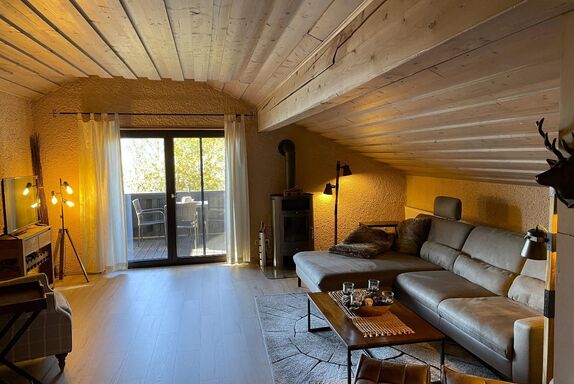 einem großzügigen Wohnraum mit Kaminofen und Wohnlandschaft, einem
