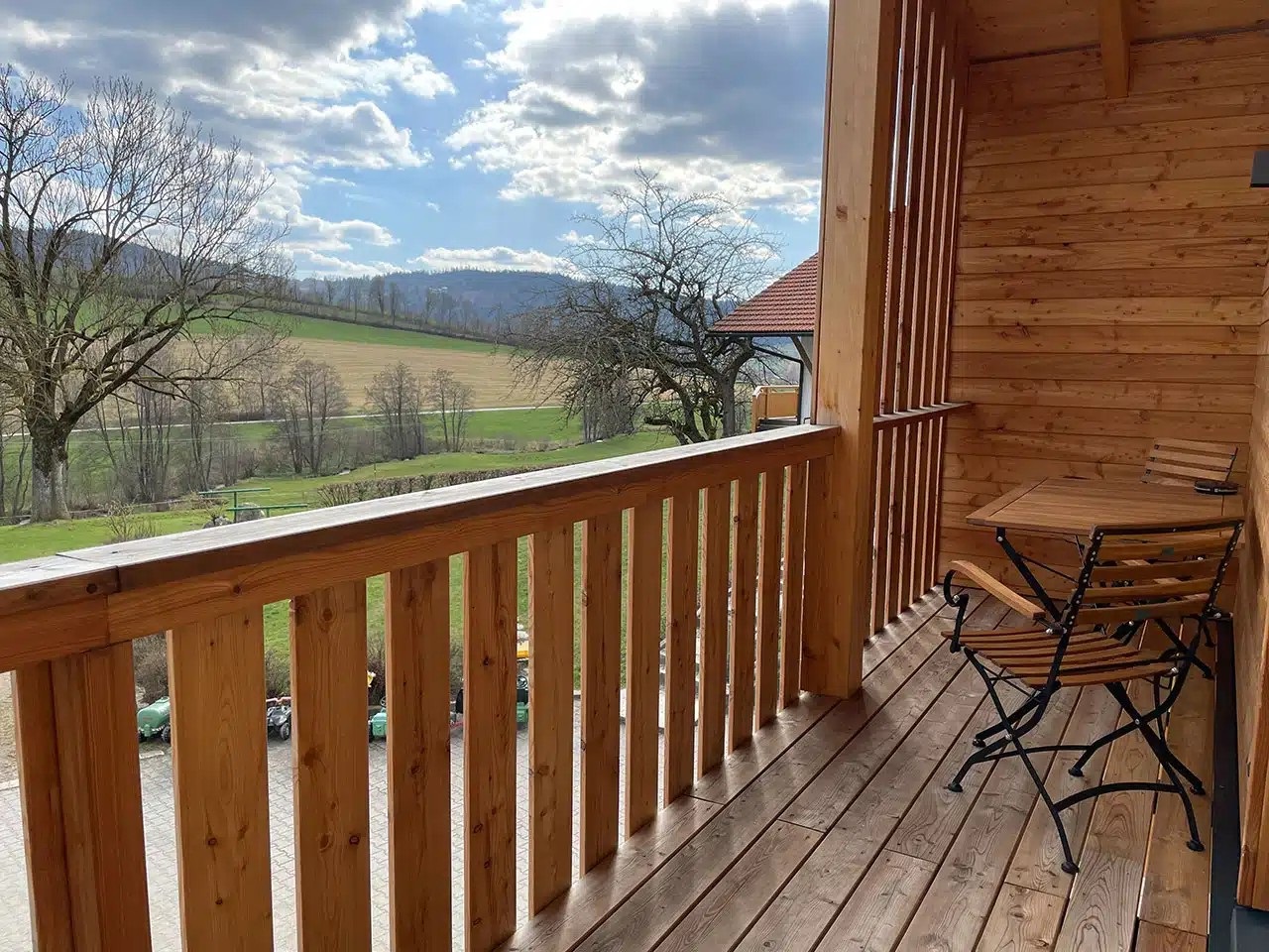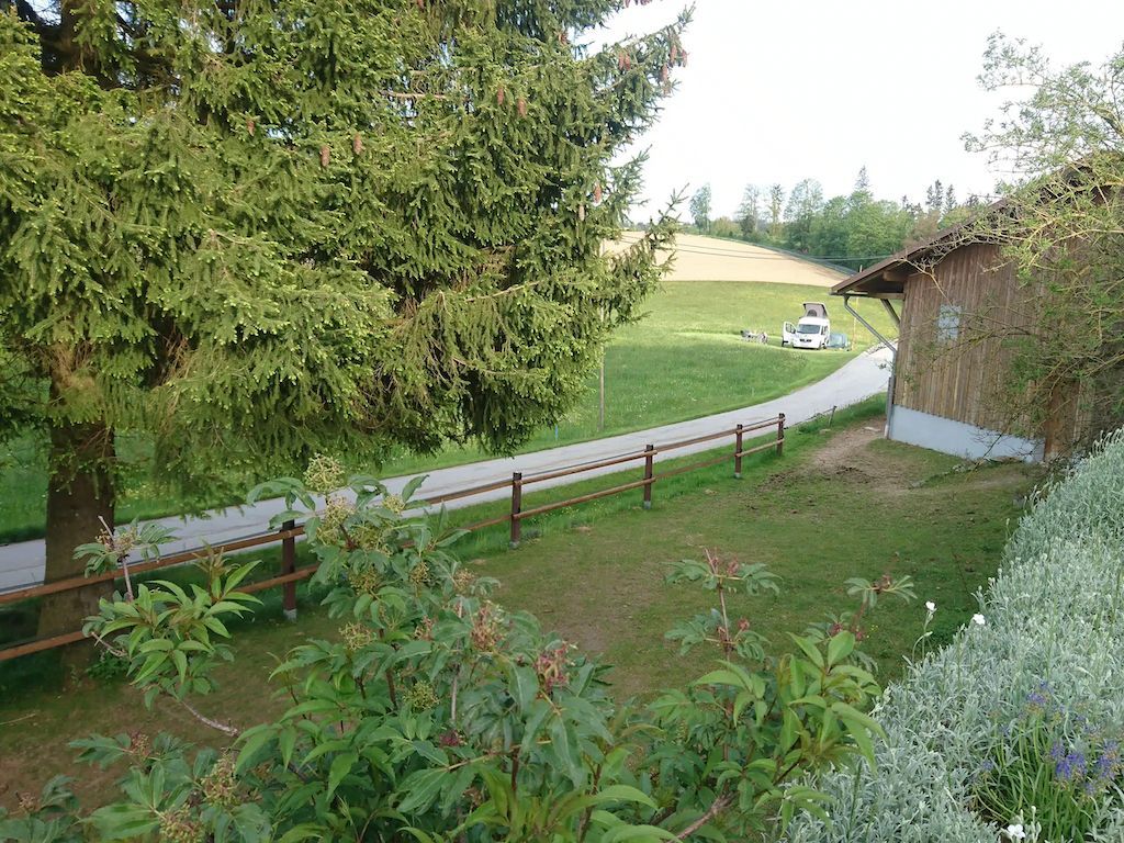 in Südausrichtung überblickt den Hof und die weiten Wiesen. Die zusätzliche Terrasse