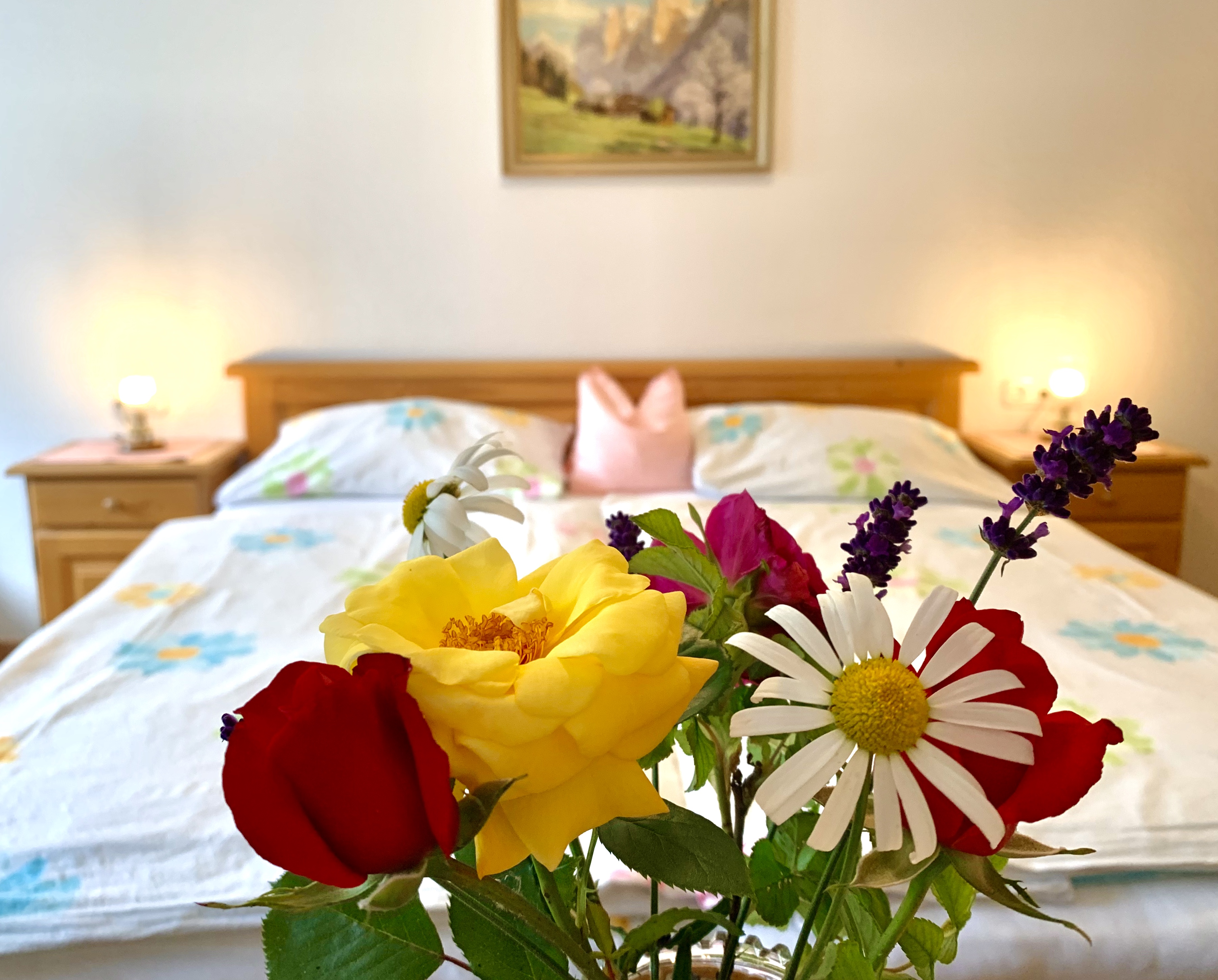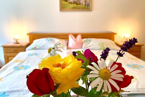 Das freundliche, helle Zimmer im Landhausstil befindet sich im 1. Stock und bietet ein bequemes Doppelbett (200 cm x 190 cm) – ideal zum Ausruhen nach einer anspruchsvollen Tour. Eine Sitzgelegenheit lädt zum Verweilen ein, und auf Anfrage stellen wir gerne eine Zusatzliege für Kinder bereit.