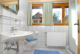 Das Badezimmer beinhaltet ein WC, eine Dsche und ein Waschbecken. Fön ist vorhanden.