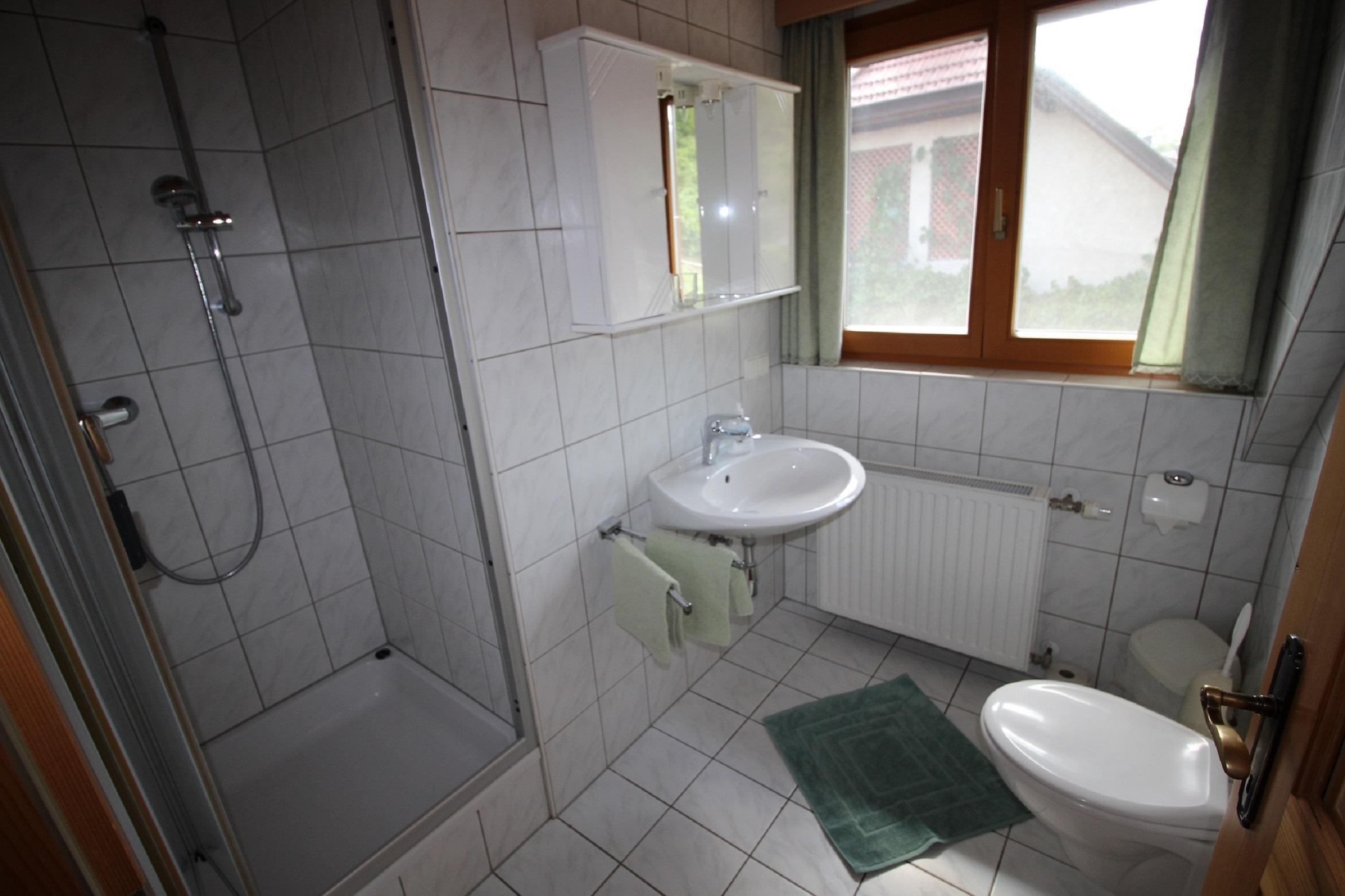 Das Badezimmer mit WC und Dusche. Fön ist vorhanden.