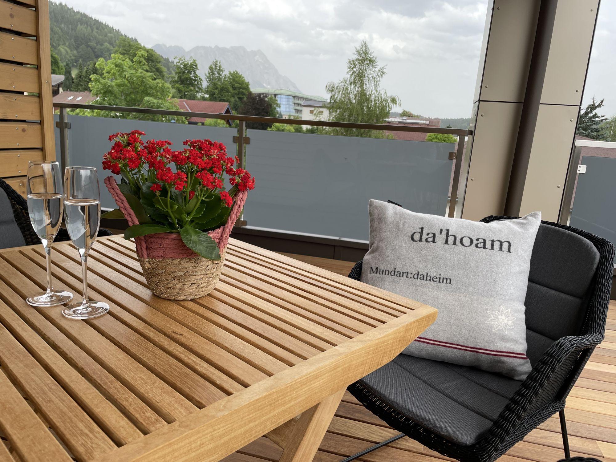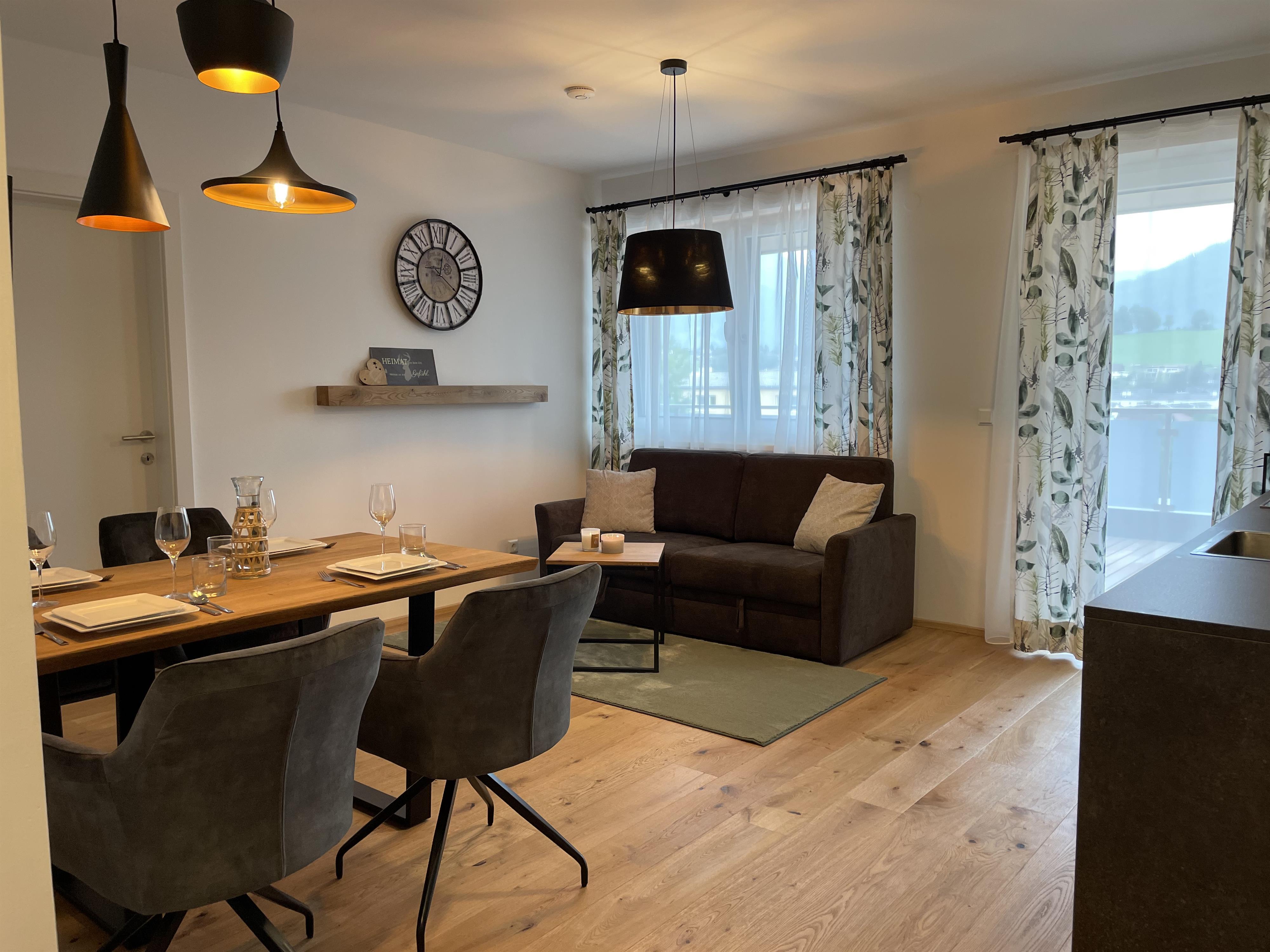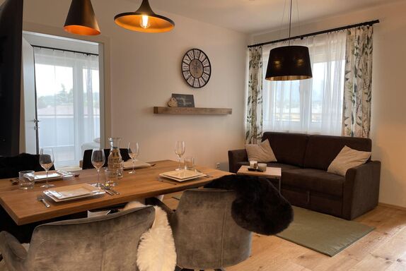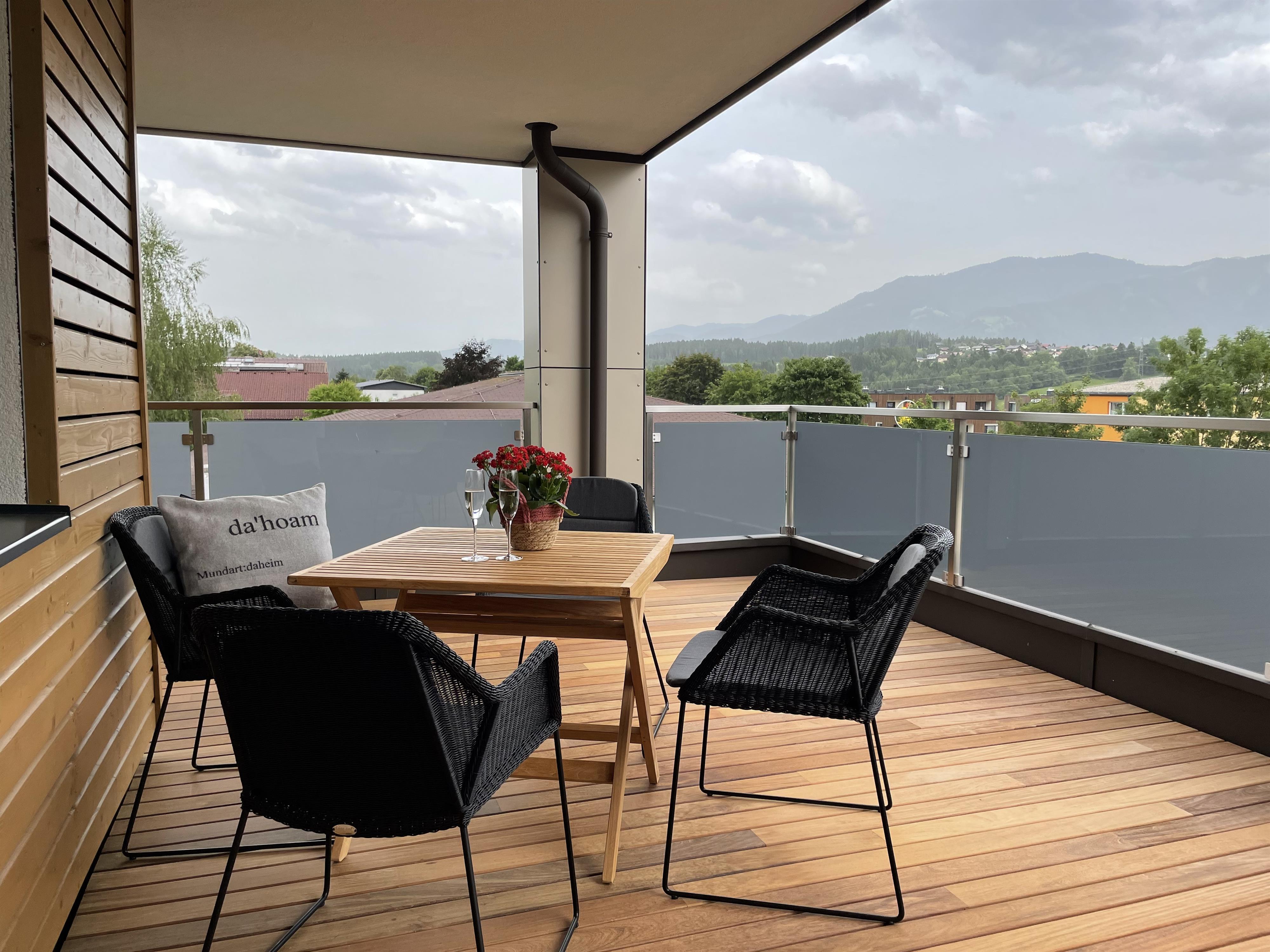 Mit seinem rustikal modernen Charme biete das Apartment eine gemütliche entspannende Atmosphäre. Einen wunderschönen Ausblick auf die Berge haben sie auf der großzügigen Terrasse.