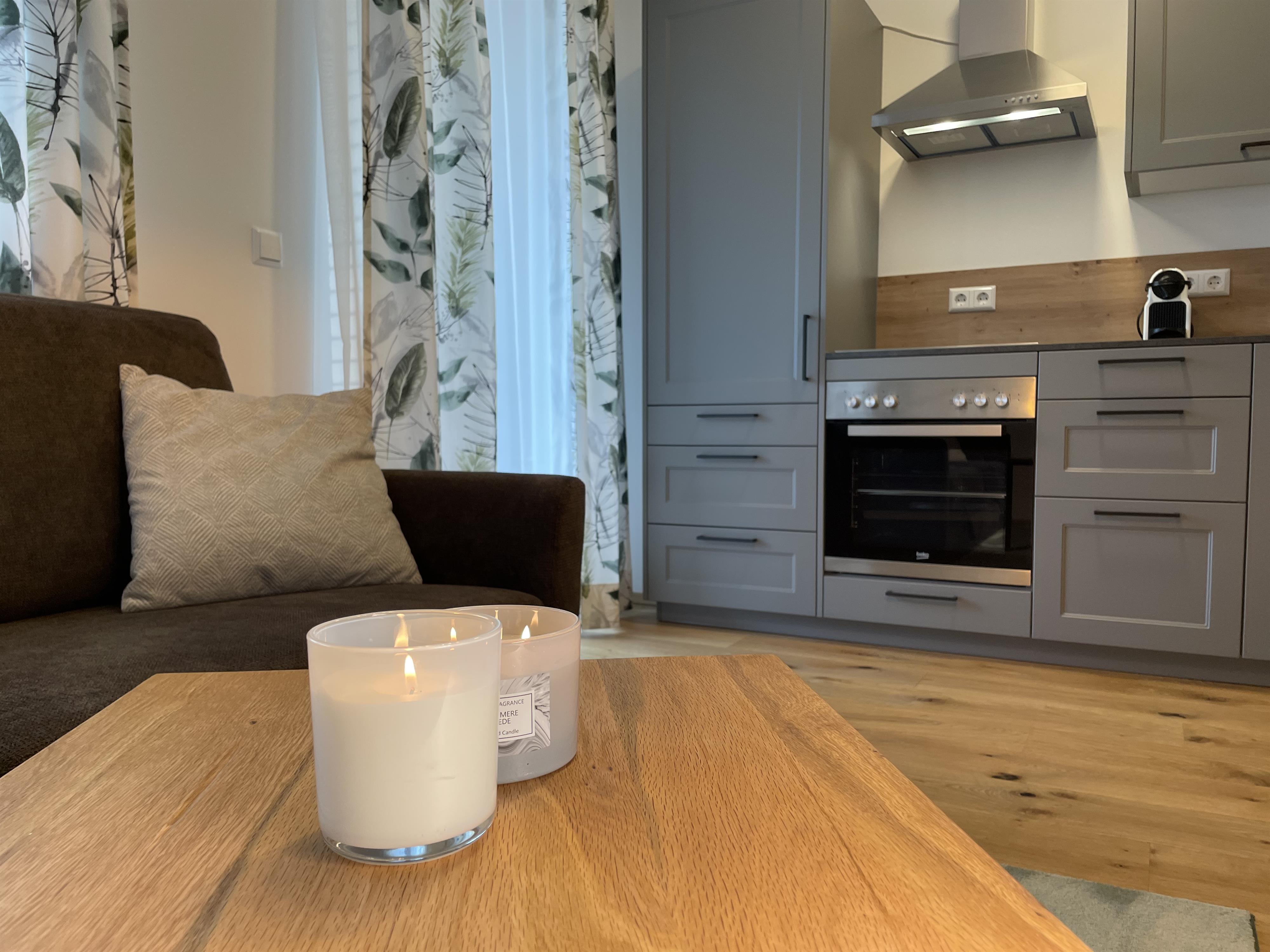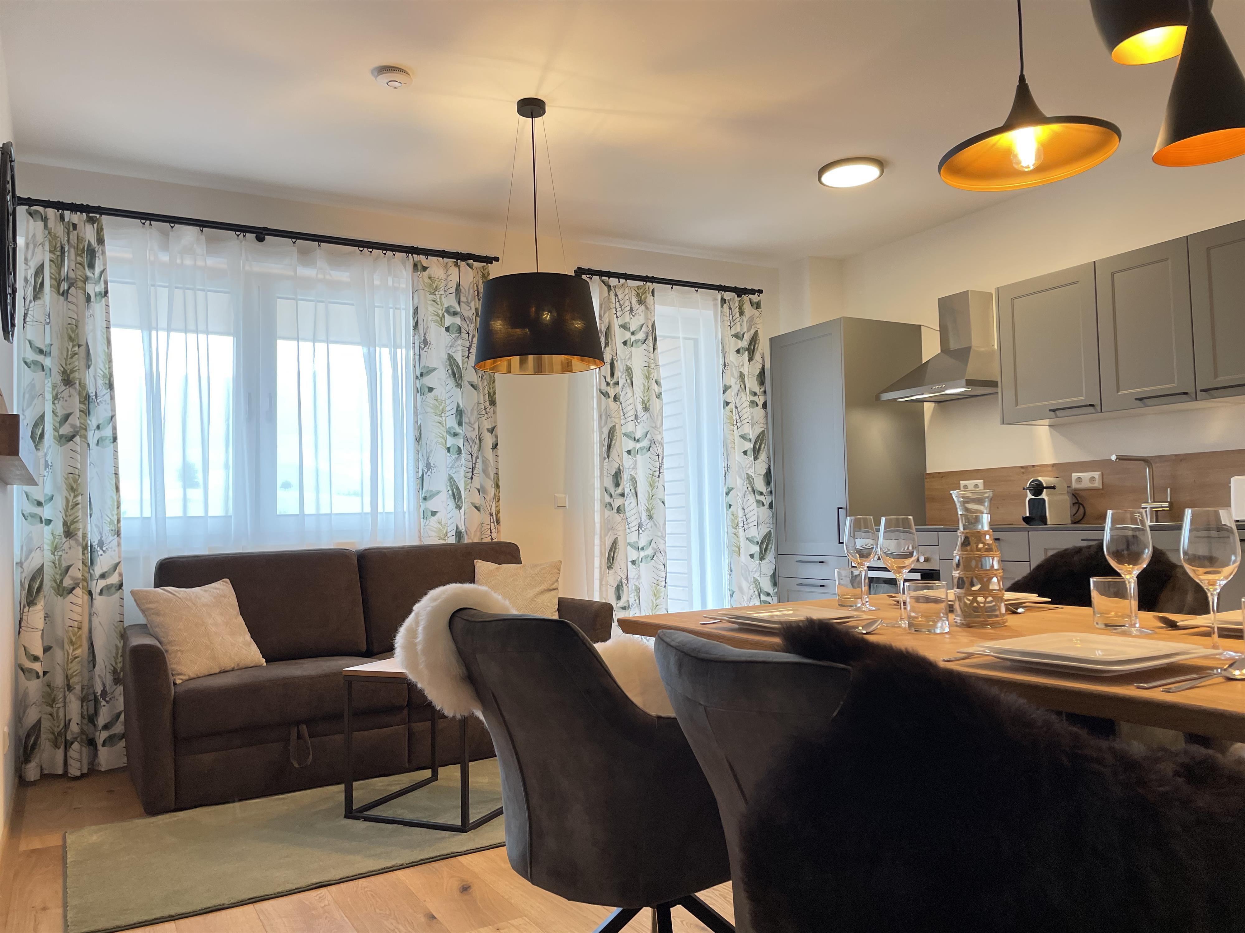 Das Apartment verfügt über ein Schlafzimmer und eine gemütliche Schlafcouch im Wohnzimmer. Es gibt eine vollausgestattete Küche mit Geschirrspüler, Backofen und Kaffeemaschine.Das Bad ist ausgestattet mit einer großzügigen Dusche. Handtücher und Bettwäsche stehen zur Verfügung.
