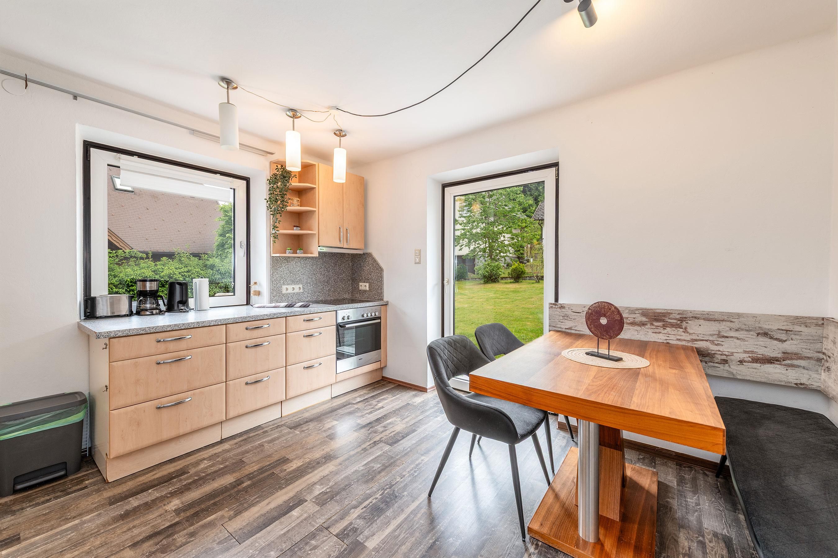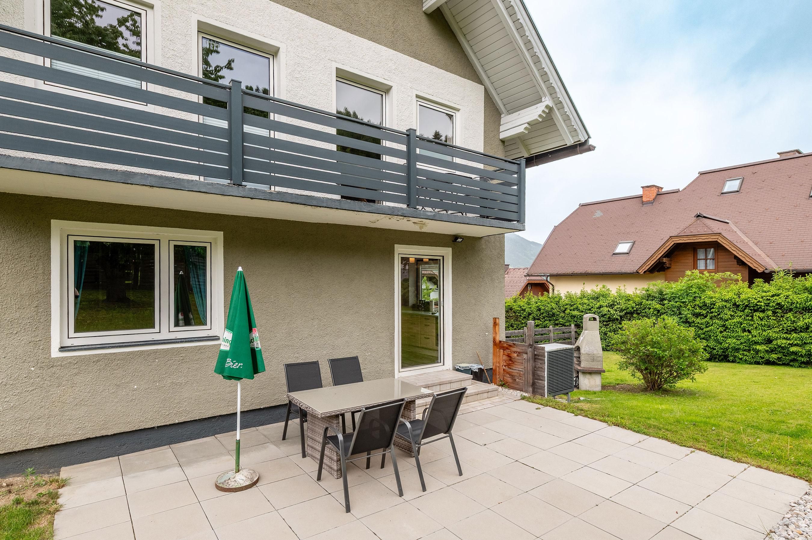 Außerdem gibt es einen direkten Zugang ins Grüne. Eine große Terrasse mit Essgruppe und ein riesiger Garten mit Grill, laden zum Verweilen ein.