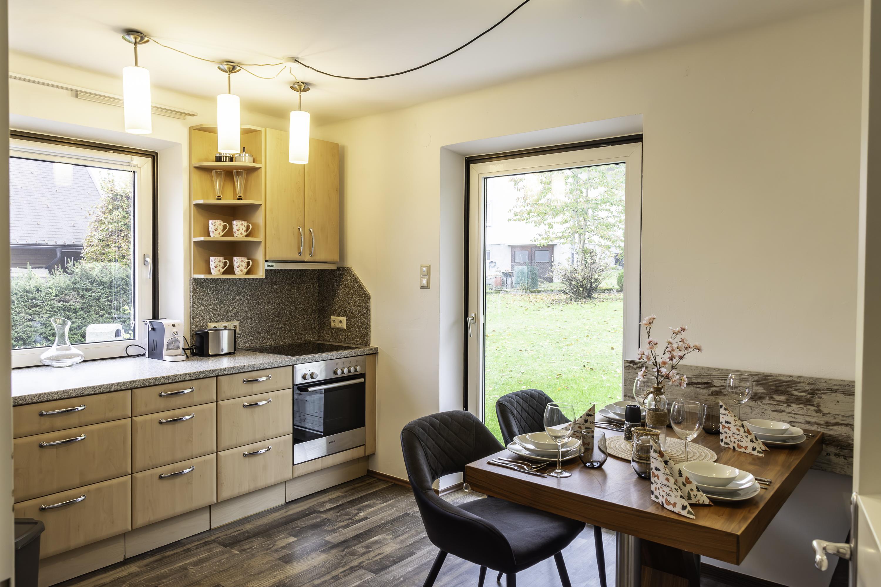 Unsere 60 m² großes Apartment 2 im EG bietet Platz für bis zu 4 Personen. Es verfügt über 2 getrennte Schlafzimmer (jeweils mit Flat-TV) und eine voll ausgestattete Küche mit gemütlicher Essecke. Die Wohnung verfügt außerdem über ein Badezimmer mit großer Dusche und WC. Außerdem gibt es einen direkten Zugang ins Grüne. Eine große Terrasse mit Essgruppe und ein riesiger Garten mit Grill, laden zum Verweilen ein.