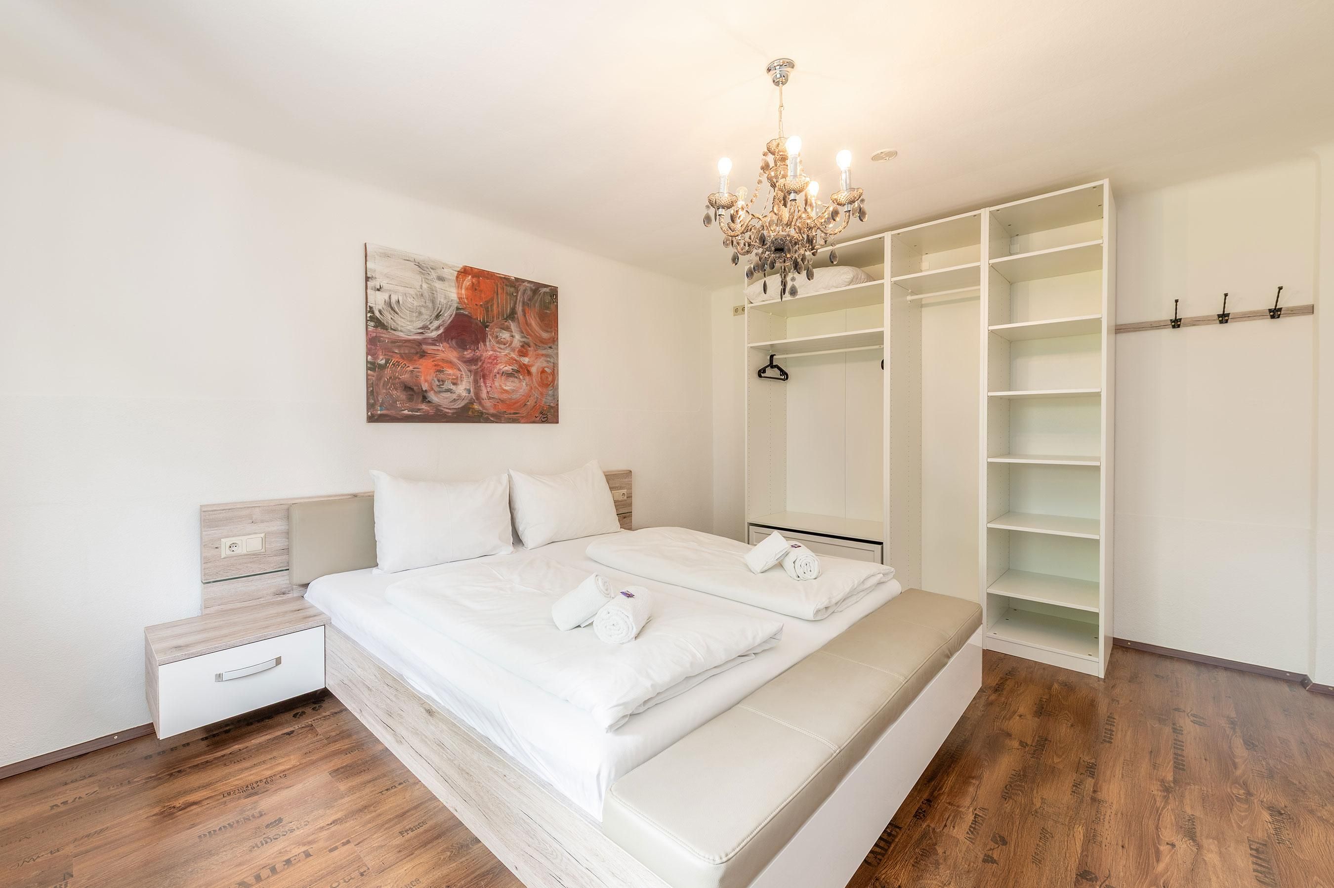 Unsere 60 m² großes Apartment 1 im Erdgeschoss bietet Platz für bis zu 4 Personen. Sie verfügt über 2 getrennte Schlafzimmer (jeweils mit Flat-TV) und eine voll ausgestattete Küche mit gemütlicher Essecke. Die Wohnung verfügt außerdem über ein Badezimmer mit großer Dusche und WC.