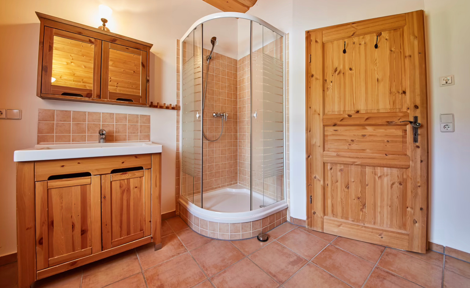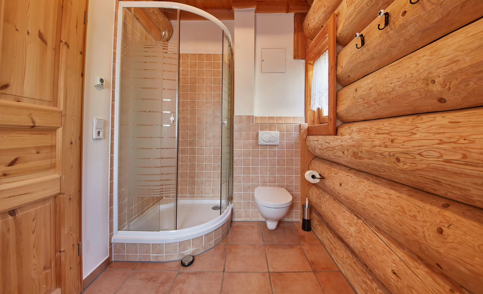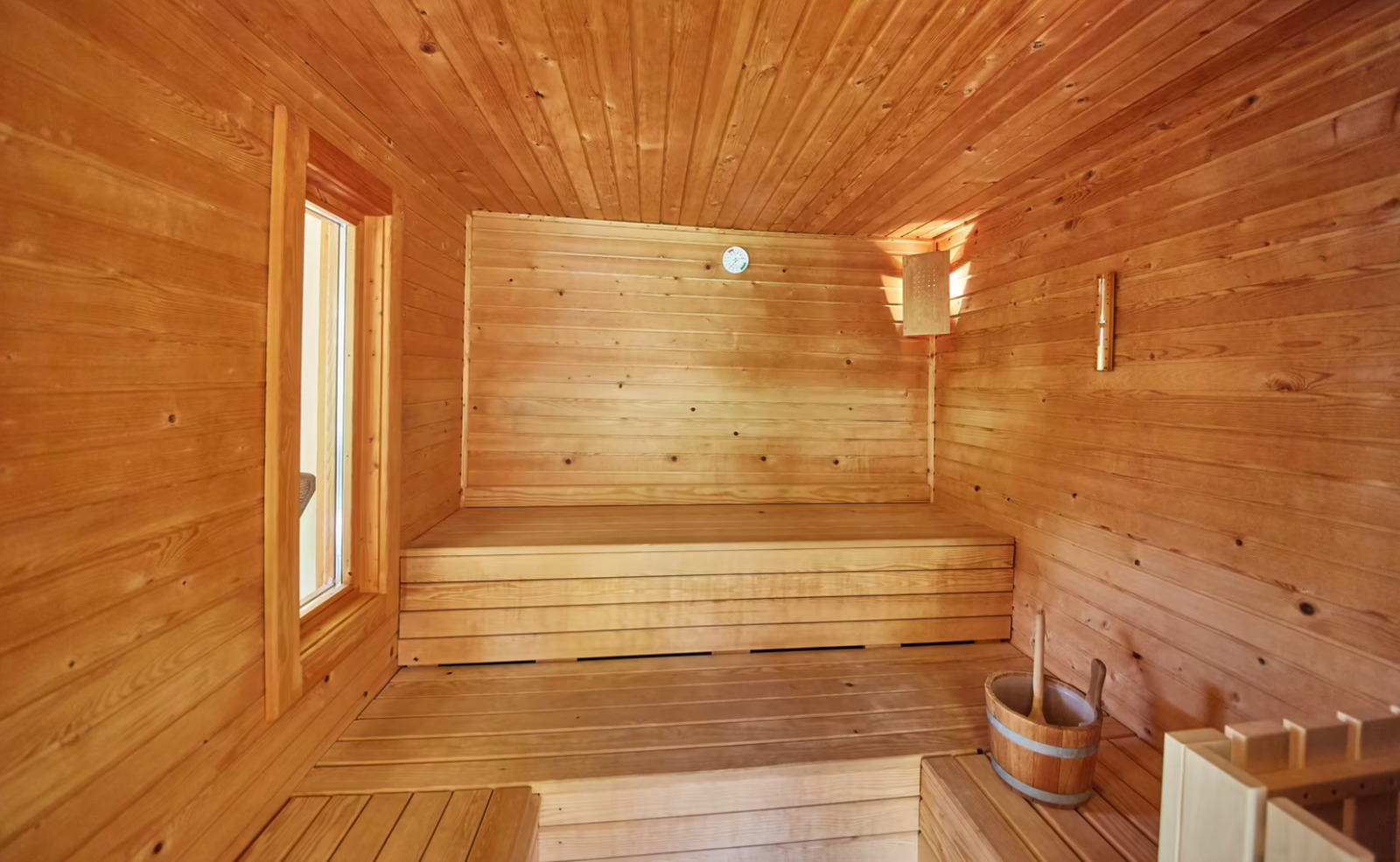 Gemeinschaftssauna: Die Sauna befindet sich im Untergeschoss der Hütte und ist über eine Außentreppe von allen Hütten zu erreichen.